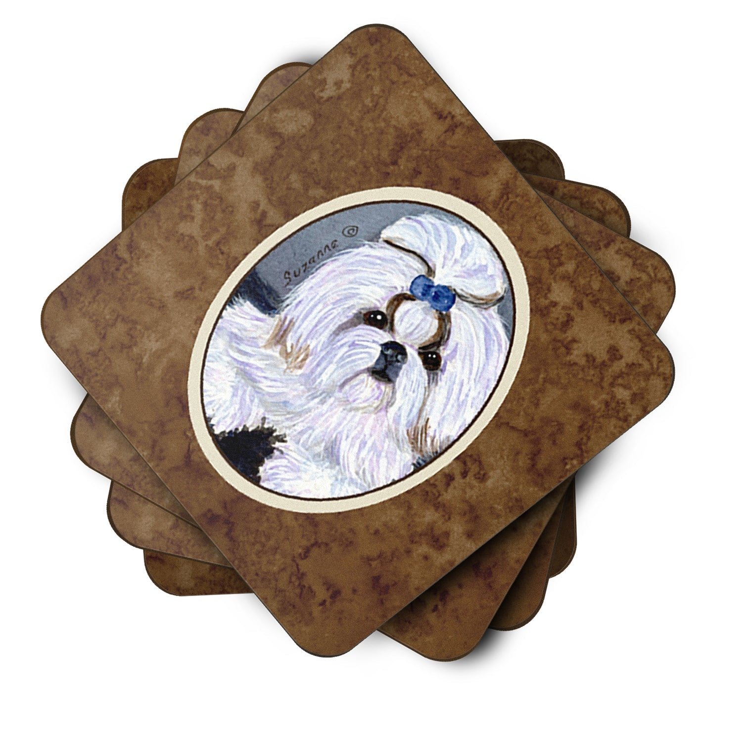 Decorate your space with our Shih Tzu artwork on a Coaster set. Presenting our Set of 4 Foam Coasters, a stylish and practical addition to your table setting. Each square coaster, measuring 3 1/2 inches by 3 1/2 inches, is perfectly sized to accommodate various drinkware, from coffee mugs to tumblers. These coasters stand out with their full-color artwork, permanently dyed onto the material for a vibrant and fade-resistant finish. They're not just functional, they're a fashionable statement, adding a touch of flair to any gathering or event. Our foam coasters serve a dual purpose - they protect your table from water stains and are perfect for both hot and cold drinks. The material used is similar to that of our high-quality mouse pads, ensuring durability and heat resistance. These coasters are easy to maintain - simply wash them in the top of your dishwasher and lay flat to dry. The design won't come off, ensuring they retain their vivid colors for years. Pair them with one of our insulated coolers or huggers for a cohesive, thoughtful gift set. Enhance your beverage experience with our Set of 4 Foam Coasters.