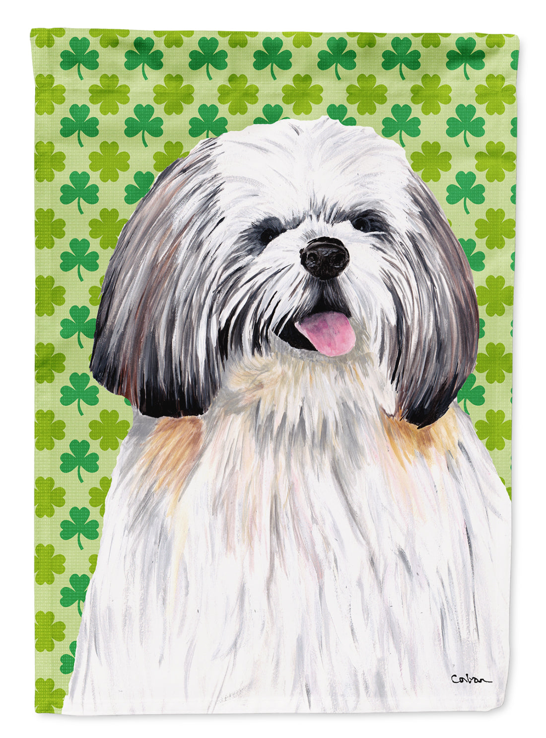 Decorate your space with our St Patrick's Day Shih Tzu artwork on a Garden Flag. Enhance the beauty of your garden, patio, or yard with Caroline's Treasures Decorative Garden Flag, proudly made in the USA. Crafted from two pieces of thick, double-sided polyester fabric, this 2-ply garden flag is designed to withstand various weather conditions, making it water-resistant and weatherproof. Featuring correctly readable words on both sides, this garden flag offers a delightful visual experience from any angle. With its heavier weight, it stands out among other garden flags, ensuring stability and durability even in wind, rain, and snow. Measuring approximately 11 1/4 inches by 15 1/2 inches, this flag allows you to personalize your outdoor decor. It comes with a 1 1/2-inch sleeve sewn in, allowing easy attachment to any standard garden flag stand or garden size porch hanger (sold separately). Make a statement in your outdoor space with Caroline's Treasures Decorative Garden Flag, a vibrant and high-quality flag that adds color and personality to your surroundings. Proudly made in the USA, it's a symbol of quality craftsmanship and attention to detail.