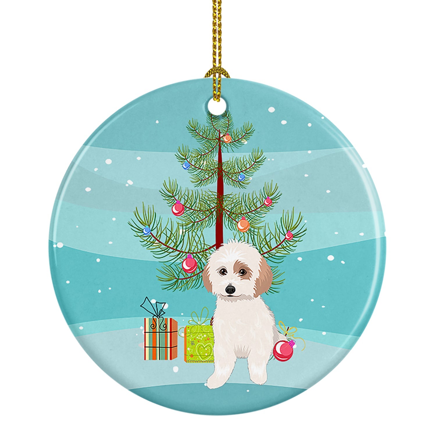 Ceramic Ornament featuring breed specific Shih Tzu artwork. Celebrate Christmas with this Christmas Ornament. Add a touch of personalized charm to your Christmas tree this holiday season with our Ceramic Ornament. Measuring 2.8125 inches in diameter, this round porcelain ornament beautifully reflects your festive lights, enhancing your holiday decor. The gloss surface sets off the vibrant, full-color artwork contributed by one of our talented artists, bringing a pop of color and joy to your tree. This Ceramic Ornament doesn't stop at being merely decorative. The white back is designed for personalization. Write a heartfelt message, mark a special year, or inscribe a date with a paint pen or a permanent marker to create a treasured memento. Please ensure you allow any personalization to dry thoroughly before handling to maintain the pristine finish. Included with the ornament is a delicate gold cord for easy hanging. Made in the USA, this Ceramic Ornament makes an exceptional gift for a pet sitter, teacher, family member, or anyone you wish to share a little Christmas magic with. With its blend of style, charm, and personal touch, it's a meaningful addition to any Christmas tree.