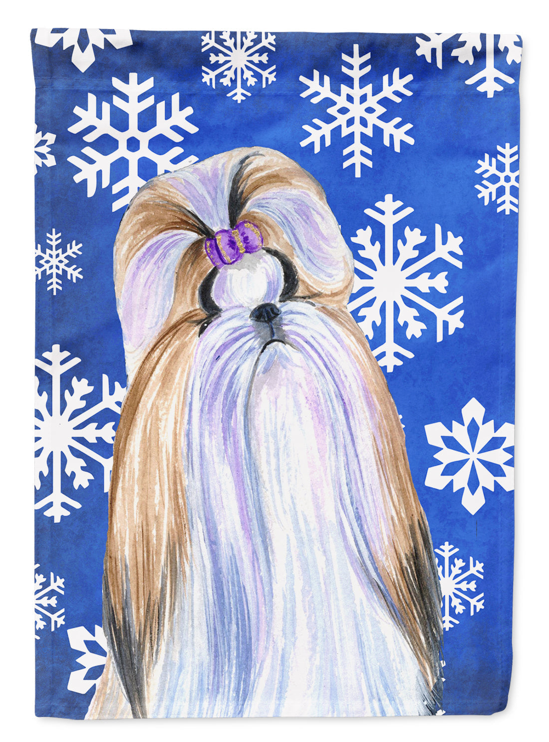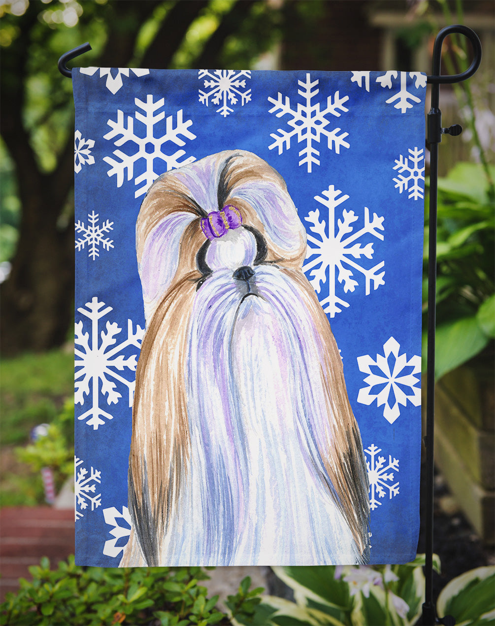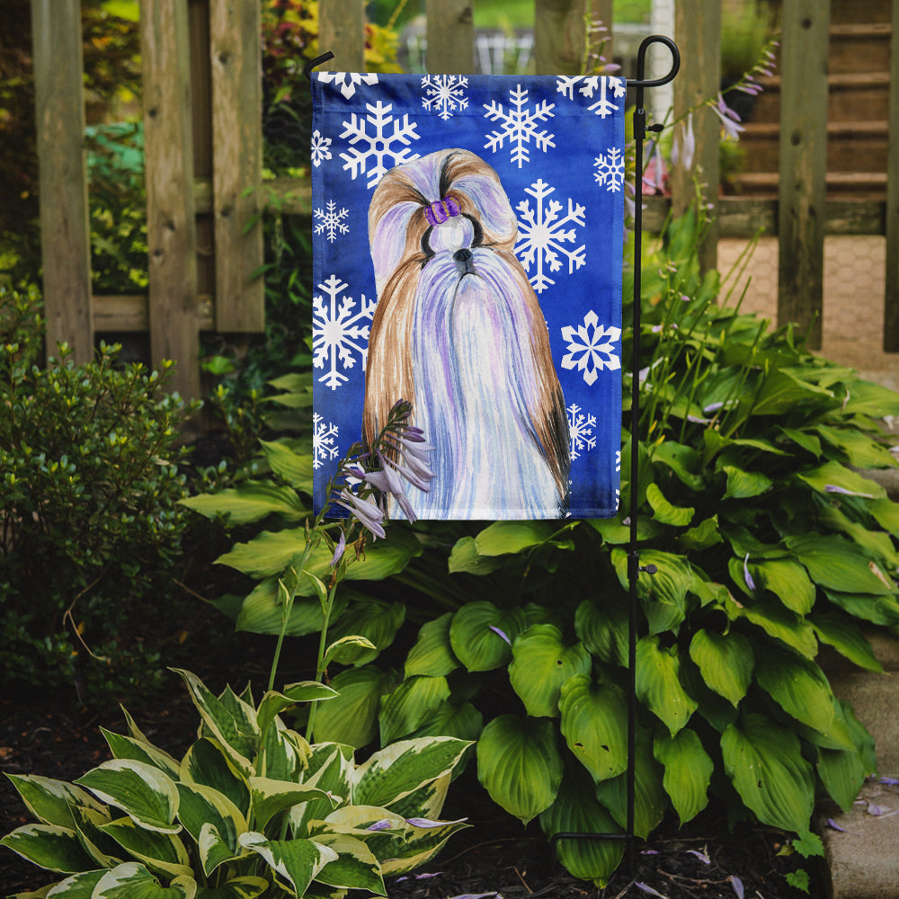 Decorate your space with our Christmas Shih Tzu artwork on a Garden Flag. Bring a bit of Winter into your home with a Winter Garden Flag. Enhance the beauty of your garden, patio, or yard with Caroline's Treasures Decorative Garden Flag, proudly made in the USA. Crafted from two pieces of thick, double-sided polyester fabric, this 2-ply garden flag is designed to withstand various weather conditions, making it water-resistant and weatherproof. Featuring correctly readable words on both sides, this garden flag offers a delightful visual experience from any angle. With its heavier weight, it stands out among other garden flags, ensuring stability and durability even in wind, rain, and snow. Measuring approximately 11 1/4 inches by 15 1/2 inches, this flag allows you to personalize your outdoor decor. It comes with a 1 1/2-inch sleeve sewn in, allowing easy attachment to any standard garden flag stand or garden size porch hanger (sold separately). Make a statement in your outdoor space with Caroline's Treasures Decorative Garden Flag, a vibrant and high-quality flag that adds color and personality to your surroundings. Proudly made in the USA, it's a symbol of quality craftsmanship and attention to detail.
