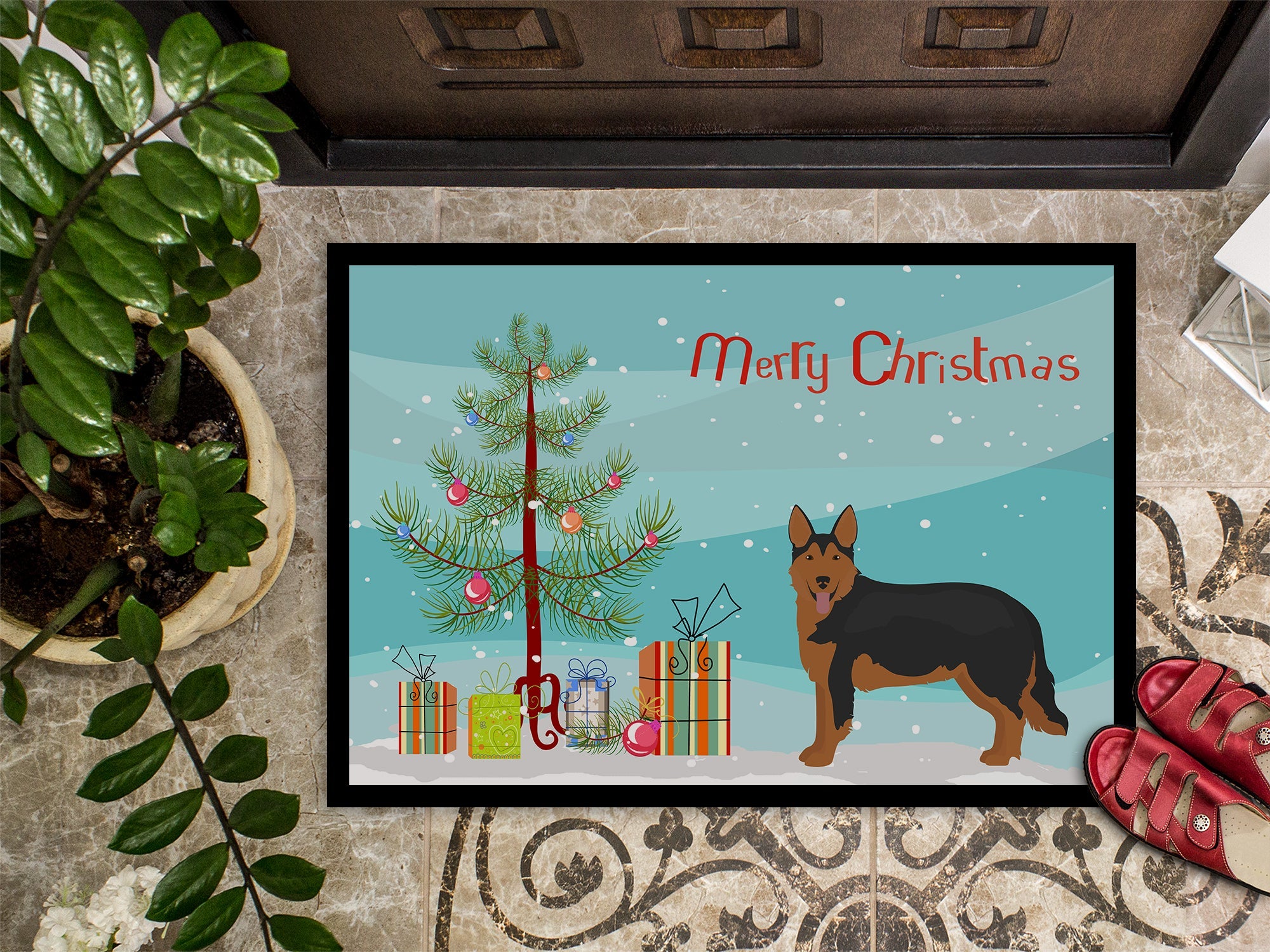 Decorate your space with our Christmas Shollie artwork on a Doormat. Welcome your guests in style with our Artwork Door Mat, designed to withstand almost any weather condition. This mat, measuring approximately 24 by 36 inches, is held together by durable black binding tape. Its top layer, composed of polyester felt, is dyed with the eye-catching image you see on the mat. A few layers below provide the mat with stability, while its rubber bottom is stamped to help prevent slipping and ensures safety. Our mat works wonderfully as both an indoor or outdoor door mat. For cleaning, simply hose it off with water or use a power washer - no need for any cleaner that produces suds. Avoid scrubbing with a brush, instead, opt for the vacuum on floor setting. Designed manufactured and printed in the USA, this mat is a perfect addition to your porch, outdoor kitchen, entryway, or any indoor space. Its unique design makes it a charming decorative rug that greets your guests and adds a stylish touch to your home decor.
