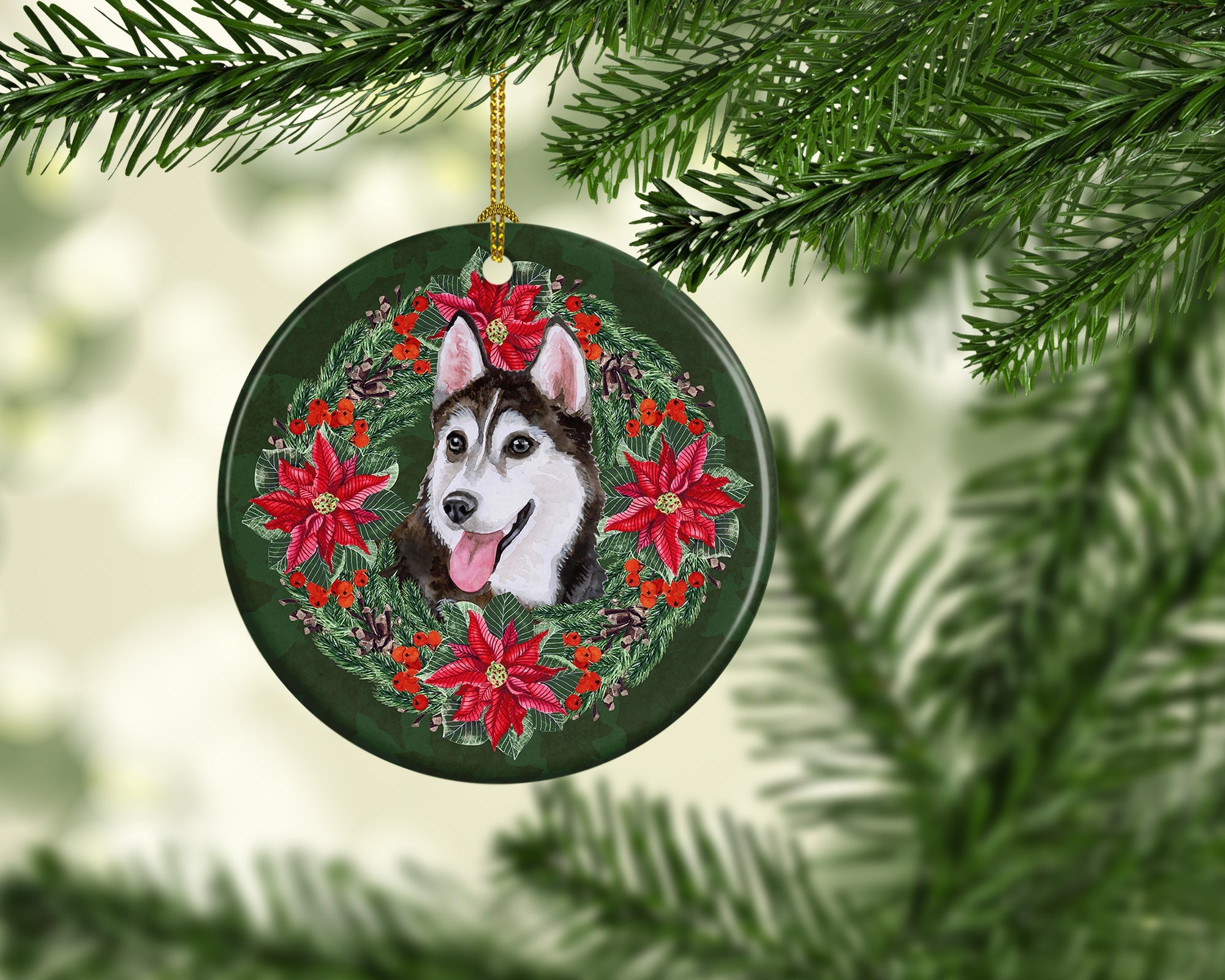 Decorate your space with our Christmas Siberian Husky artwork on a Ornament. Add a touch of personalized charm to your Christmas tree this holiday season with our Ceramic Ornament. Measuring 2.8125 inches in diameter, this round porcelain ornament beautifully reflects your festive lights, enhancing your holiday decor. The gloss surface sets off the vibrant, full-color artwork contributed by one of our talented artists, bringing a pop of color and joy to your tree. This Ceramic Ornament doesn't stop at being merely decorative. The white back is designed for personalization. Write a heartfelt message, mark a special year, or inscribe a date with a paint pen or a permanent marker to create a treasured memento. Please ensure you allow any personalization to dry thoroughly before handling to maintain the pristine finish. Included with the ornament is a delicate gold cord for easy hanging. Made in the USA, this Ceramic Ornament makes an exceptional gift for a pet sitter, teacher, family member, or anyone you wish to share a little Christmas magic with. With its blend of style, charm, and personal touch, it's a meaningful addition to any Christmas tree.