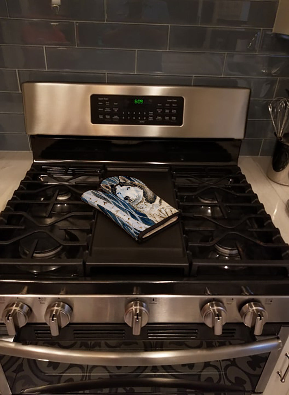 Decorate your space with our Siberian Husky artwork on a Oven Mitt. Presenting our Large Right Hand Thick Heat Resistant Oven Mitt, an indispensable tool for any culinary enthusiast. This mitt boasts layers of quilted protection on both sides, providing outstanding resistance against extreme heat. Embellished with beautifully printed artwork, it adds an extra dash of charm to your kitchen decor. At about 12 inches long and 8 1/2 inches wide, this oven mitt offers a generous fit, accommodating a diverse range of hand sizes. Its design is enhanced by a sleek Black bias tape trim, finished with a convenient hoop for easy hanging. Fresh out of the packaging, the quilting process may give the mitt a stiff feel, but rest assured, it will soften with use and washing. Our mitt is crafted with a unique center fabric, Insul-Bright, a composite material made from polyester fibers, needle-punched through a nonwoven substrate and a reflective metallized film. This smart material resists both conduction and radiant energy, reflecting heat back to its source, all while remaining breathable. Our oven mitt is machine washable and safe for tumble drying. It's a perfect gift for your favorite Chef, BBQ enthusiast, or just a little treat for yourself! Experience safety, style, and convenience rolled into one with this exceptional oven mitt.