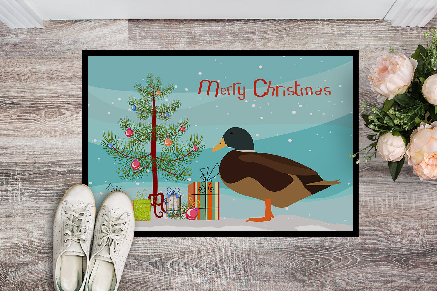 Decorate your space with our Christmas Silver Bantam Duck artwork on a Doormat. Welcome your guests in style with our Artwork Door Mat, designed to withstand almost any weather condition. This mat, measuring approximately 24 by 36 inches, is held together by durable black binding tape. Its top layer, composed of polyester felt, is dyed with the eye-catching image you see on the mat. A few layers below provide the mat with stability, while its rubber bottom is stamped to help prevent slipping and ensures safety. Our mat works wonderfully as both an indoor or outdoor door mat. For cleaning, simply hose it off with water or use a power washer - no need for any cleaner that produces suds. Avoid scrubbing with a brush, instead, opt for the vacuum on floor setting. Designed manufactured and printed in the USA, this mat is a perfect addition to your porch, outdoor kitchen, entryway, or any indoor space. Its unique design makes it a charming decorative rug that greets your guests and adds a stylish touch to your home decor.
