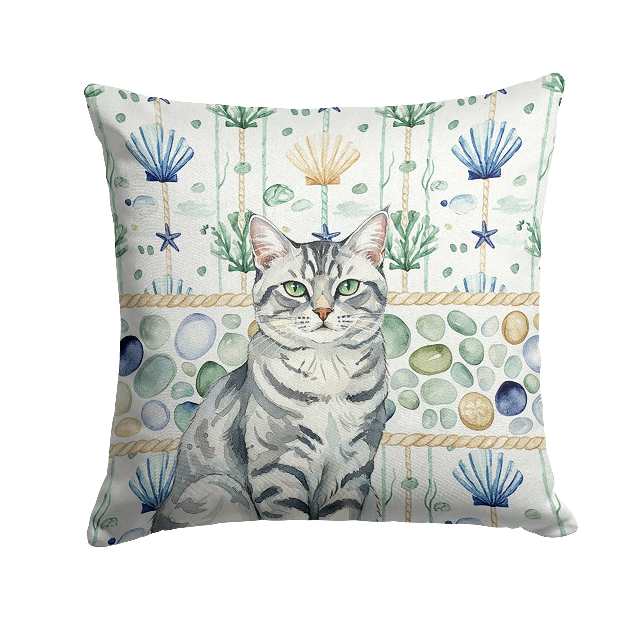 Throw Pillow featuring breed specific Silver Classic Tabby artwork. Revitalize your outdoor or indoor living space with Caroline's Treasures 18x18 Fabric Decorative Pillow. With a generously sized dimension of approximately 18 inches by 18 inches, this pillow makes a comfortable and aesthetic addition to any seating area. Made from a unique, water-resistant material developed by Caroline's Treasures, the pillow sham is 100% polyester fabric that's durable and ready to weather any condition. Its vibrant, full-color artwork will not fade over time as it is dyed with color-fast dyes. Whether you place it on your patio furniture, porch, veranda, or indoor couch, its soft canvas fabric ensures a cozy experience. The pillow is handcrafted in the United States, featuring a sham created from three pieces of fabric and a polyester insert for enduring shape and overstuffed comfort. Despite being robustly built to endure the outdoors, it is as soft and snug as your favorite indoor cushions. Please note, as all our pillows are handmade, sizes may vary slightly, adding to the charm of this unique decorative item.