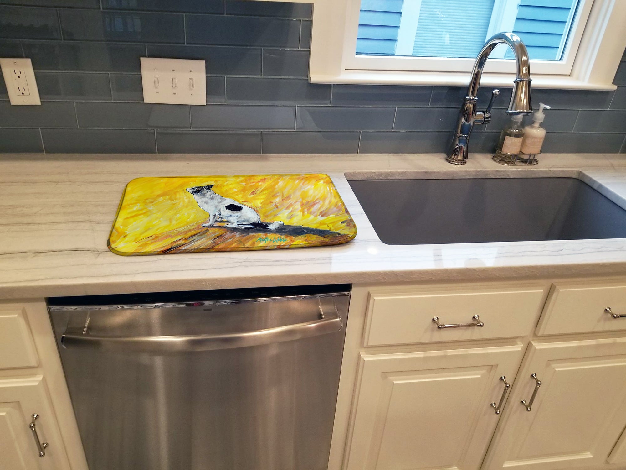 Say goodbye to messy countertops and soggy dish towels with our innovative dish drying mat. Our high-quality dish drying pad is designed to keep your countertops dry while offering a stylish and efficient solution. Whether you're air drying dishes, glasses, stemware, silverware, pots, pans, bottles, or even fruits and vegetables, our dish mat is the perfect choice. The 14 inches x 22 inches size fits most counters and dish drying racks, and the non-slip design ensures stability. Made with water-absorbent polyester and a polyurethane foam insert, our dish drying mat is not only functional but also durable. It's machine washable and printed in the USA for long-lasting use. The beautiful artwork adds flair to your kitchen decor, making it a perfect housewarming gift or present for any occasion. Upgrade your kitchen experience with our absorbent and versatile dish drying mat.