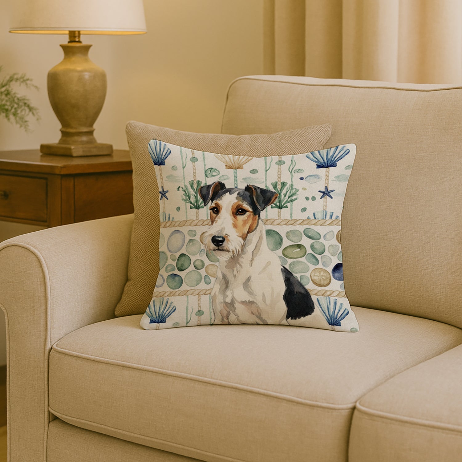 Throw Pillow featuring breed specific Smooth Fox Terrier artwork. Revitalize your outdoor or indoor living space with Caroline's Treasures 18x18 Fabric Decorative Pillow. With a generously sized dimension of approximately 18 inches by 18 inches, this pillow makes a comfortable and aesthetic addition to any seating area. Made from a unique, water-resistant material developed by Caroline's Treasures, the pillow sham is 100% polyester fabric that's durable and ready to weather any condition. Its vibrant, full-color artwork will not fade over time as it is dyed with color-fast dyes. Whether you place it on your patio furniture, porch, veranda, or indoor couch, its soft canvas fabric ensures a cozy experience. The pillow is handcrafted in the United States, featuring a sham created from three pieces of fabric and a polyester insert for enduring shape and overstuffed comfort. Despite being robustly built to endure the outdoors, it is as soft and snug as your favorite indoor cushions. Please note, as all our pillows are handmade, sizes may vary slightly, adding to the charm of this unique decorative item.