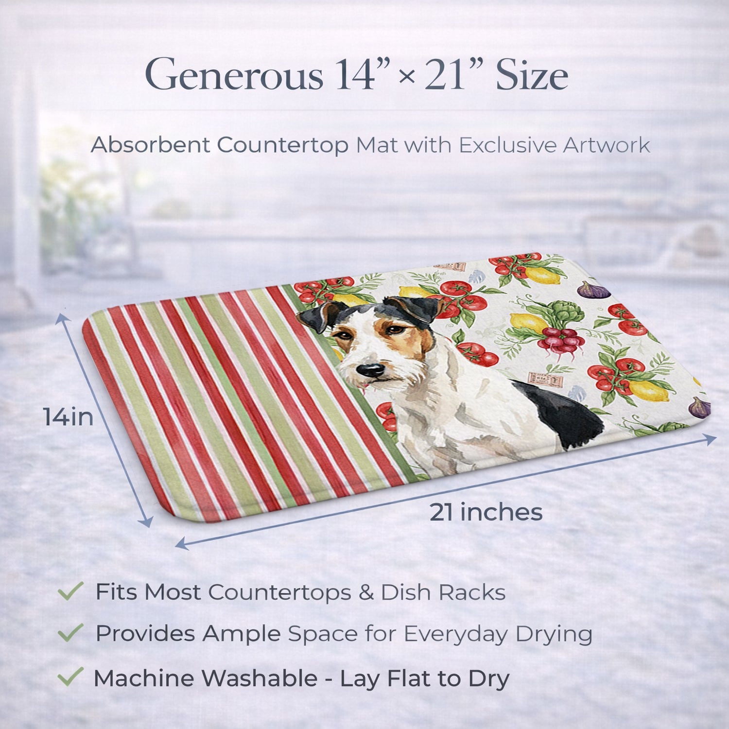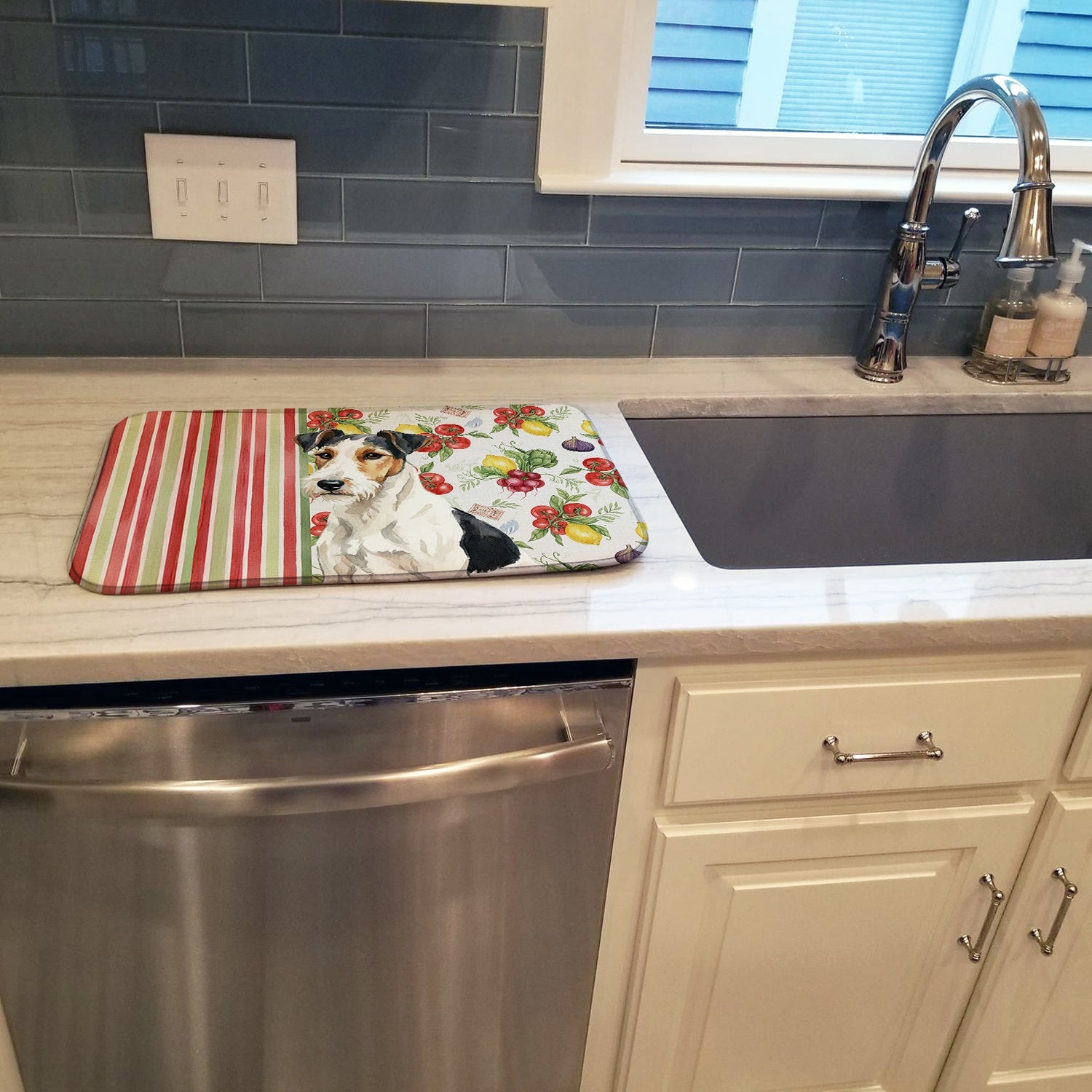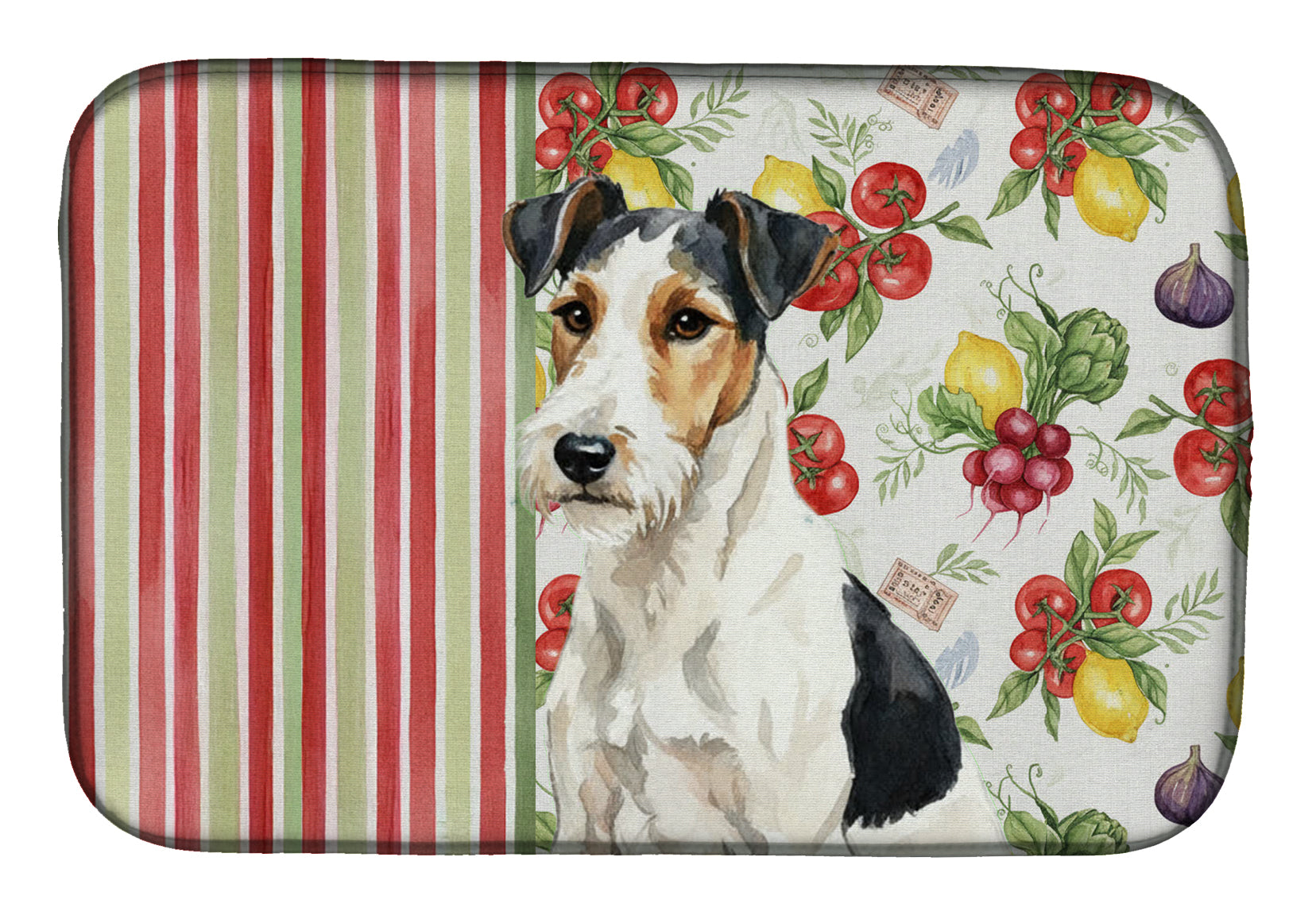 Shown here is the Smooth Fox Terrier Vegetables Dish Drying Mat from Caroline's Treasures featuring artwork of a Smooth Fox Terrier in a Everyday design. The detailed illustration and vibrant colors make it a standout accent that celebrates both seasonal style and love for the subject. This image features a vibrant watercolor vegetable pattern with tomatoes, lemons, artichokes, figs, radishes, and leafy greens arranged in a repeating design, paired with classic red and green stripes. The bright, garden-fresh palette creates a cheerful, farmhouse-inspired look that feels lively, welcoming, and perfect for kitchen décor. Everyday décor celebrates personal style and the small moments that make a house feel like home. Thoughtful designs add warmth and personality that can be enjoyed year-round. Say goodbye to messy countertops and soggy dish towels with our innovative dish drying mat. Our high-quality dish drying pad is designed to keep your countertops dry while offering a stylish and efficient solution. Whether you're air drying dishes, glasses, stemware, silverware, pots, pans, bottles, or even fruits and vegetables, our dish mat is the perfect choice. The 14 inches x 21 inches size fits most counters and dish drying racks, and the non-slip design ensures stability. Made with water-absorbent polyester and a polyurethane foam insert, our dish drying mat is not only functional but also durable. It's machine washable and printed in the USA for long-lasting use. The beautiful artwork adds flair to your kitchen decor, making it a perfect housewarming gift or present for any occasion. Upgrade your kitchen experience with our absorbent and versatile dish drying mat. Perfect for: Kitchen counters and sinks, everyday dish drying and countertop protection, Dogs-themed homes, or year-round use for Smooth Fox Terrier lovers. Smooth Fox Terriers feature sleek coats and athletic builds. Their appearance reflects confidence and alert energy. Makes a heartfelt gift for: Smooth Fox Terrier owners, Dogs lovers, Everyday gifts, pet parents, friends who adore their Smooth Fox Terrier, or anyone celebrating Dogs.