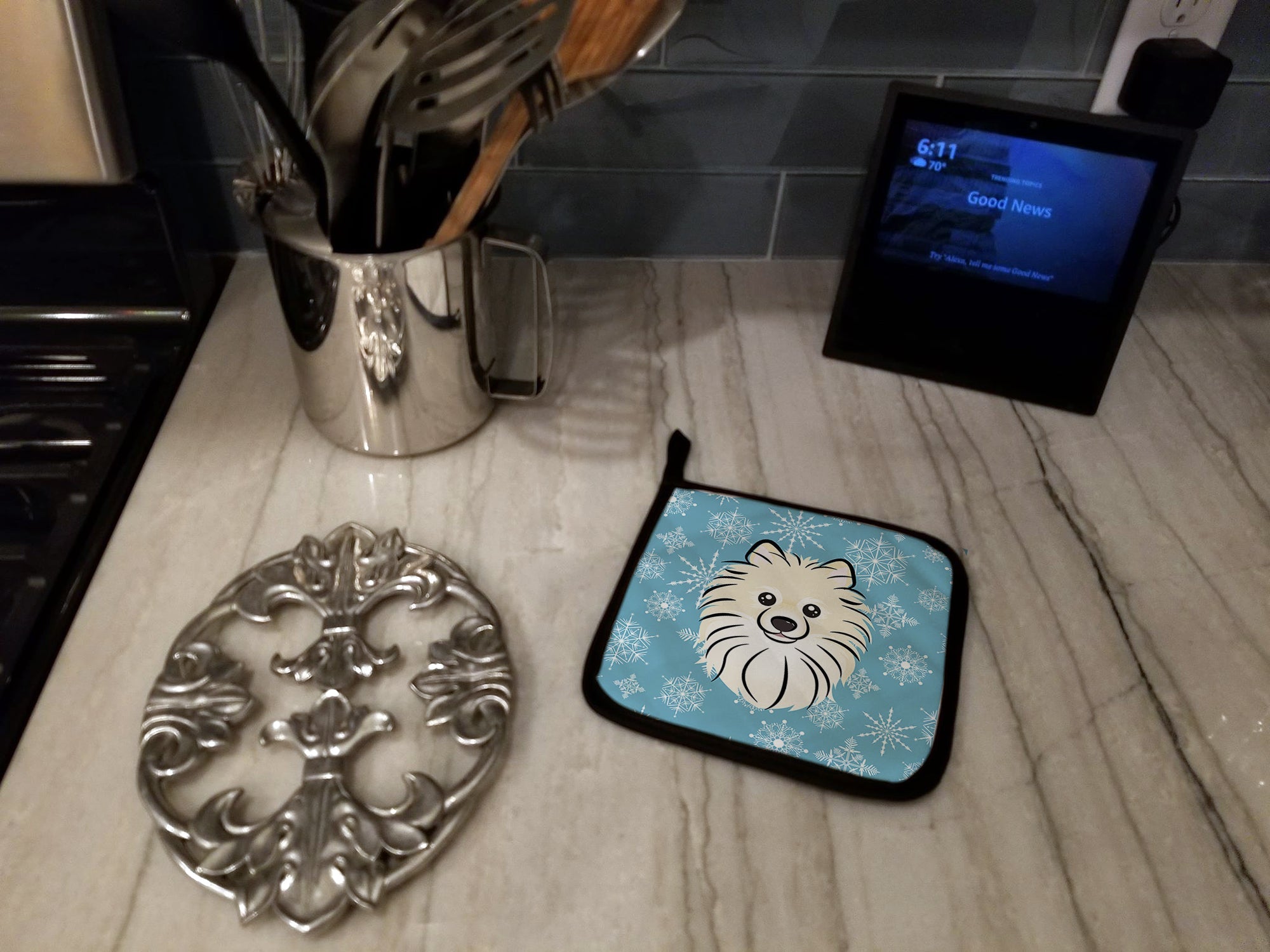 Decorate your space with our Christmas Pomeranian artwork on a Pair of Pot Holders. A Pair of Pot Holders to match your kitchen decor. Made in the USA these are thick and functional. Full color artwork decorates the front polyester fabric of the hot pad and accented by a black trim. Use these at as a trivet for your Thanksgiving or Christmas tablescape. Filled with insulated fabric and quilted for durability. These colorful pot holders will make a great gift for your favorite home cook or executive chef. Each pot holder measures approximately 7 1/2 inches by 7 1/2 inches. A hanging tab is included.