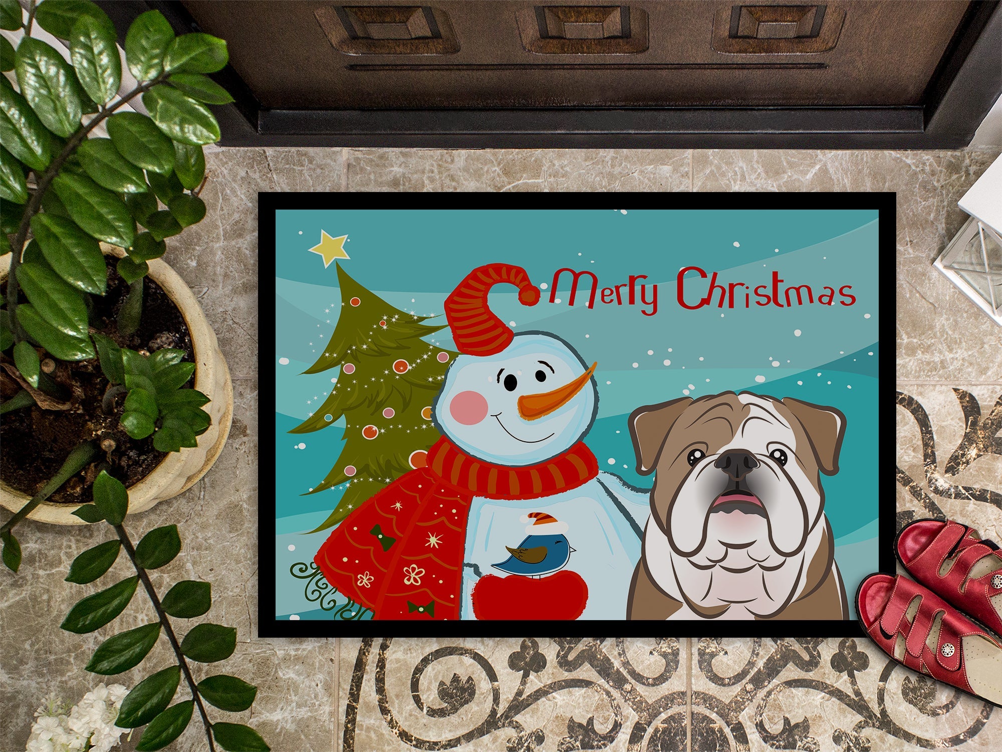 Decorate your space with our Christmas Bulldog, English Bulldog artwork on a Doormat. Welcome your guests in style with our Artwork Door Mat, designed to withstand almost any weather condition. This mat, measuring approximately 24 by 36 inches, is held together by durable black binding tape. Its top layer, composed of polyester felt, is dyed with the eye-catching image you see on the mat. A few layers below provide the mat with stability, while its rubber bottom is stamped to help prevent slipping and ensures safety. Our mat works wonderfully as both an indoor or outdoor door mat. For cleaning, simply hose it off with water or use a power washer - no need for any cleaner that produces suds. Avoid scrubbing with a brush, instead, opt for the vacuum on floor setting. Designed manufactured and printed in the USA, this mat is a perfect addition to your porch, outdoor kitchen, entryway, or any indoor space. Its unique design makes it a charming decorative rug that greets your guests and adds a stylish touch to your home decor.