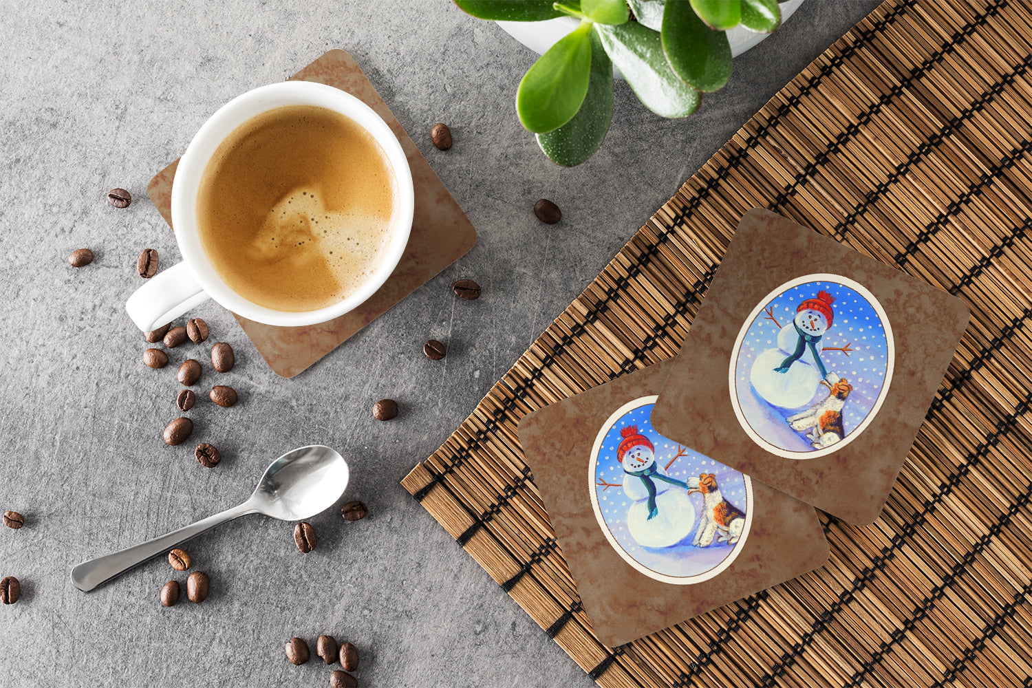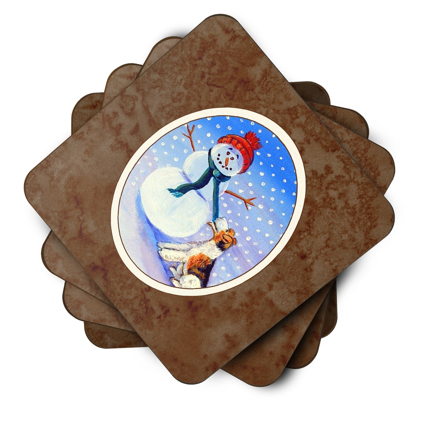 Decorate your space with our Christmas Fox Terrier artwork on a Coaster set. Presenting our Set of 4 Foam Coasters, a stylish and practical addition to your table setting. Each square coaster, measuring 3 1/2 inches by 3 1/2 inches, is perfectly sized to accommodate various drinkware, from coffee mugs to tumblers. These coasters stand out with their full-color artwork, permanently dyed onto the material for a vibrant and fade-resistant finish. They're not just functional, they're a fashionable statement, adding a touch of flair to any gathering or event. Our foam coasters serve a dual purpose - they protect your table from water stains and are perfect for both hot and cold drinks. The material used is similar to that of our high-quality mouse pads, ensuring durability and heat resistance. These coasters are easy to maintain - simply wash them in the top of your dishwasher and lay flat to dry. The design won't come off, ensuring they retain their vivid colors for years. Pair them with one of our insulated coolers or huggers for a cohesive, thoughtful gift set. Enhance your beverage experience with our Set of 4 Foam Coasters.