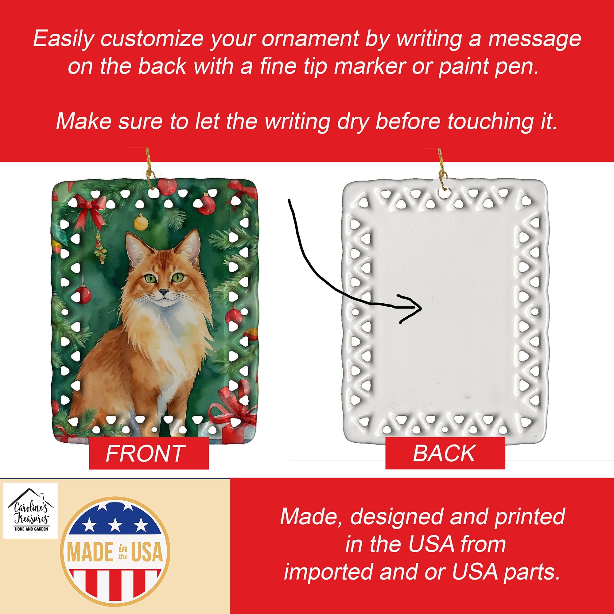 Porcelain Ornament featuring breed specific Somali Cat artwork. Celebrate Christmas with this Christmas Ornament. Add a unique, personal touch to your holiday decor with our Rectangular Lattice Porcelain Ornament. Perfect for creating cherished memories, this high-quality ornament shines under festive lights, reflecting warmth and joy throughout your Christmas tree. Crafted with a glossy finish, it showcases vibrant, full-color artwork contributed by our talented artists, ensuring your tree is adorned with a burst of color and holiday spirit. What sets this Porcelain Ornament apart is its customizable white back. Use a paint pen or permanent marker to write a heartfelt message, commemorate a special year, or mark an unforgettable date, turning this ornament into a keepsake that will be treasured for years to come. For best results, allow any personalization to dry thoroughly before handling. Each ornament comes complete with a delicate gold cord, making it easy to hang and display. Proudly made in the USA, this ornament measures 3.375 x 2.625 inches and is a thoughtful gift for pet sitters, teachers, family members, or anyone who would appreciate a little extra holiday magic. Bring style, charm, and a touch of personal meaning to your Christmas tree with this beautifully designed ornament..