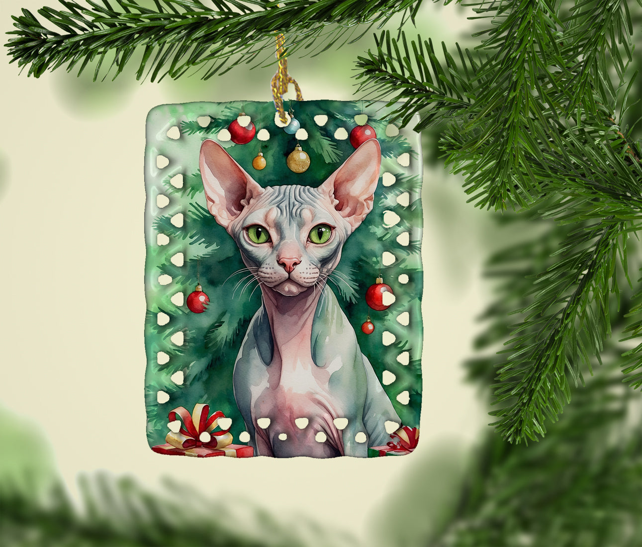 Porcelain Ornament featuring breed specific Sphynx Cat artwork. Celebrate Christmas with this Christmas Ornament. Add a unique, personal touch to your holiday decor with our Rectangular Lattice Porcelain Ornament. Perfect for creating cherished memories, this high-quality ornament shines under festive lights, reflecting warmth and joy throughout your Christmas tree. Crafted with a glossy finish, it showcases vibrant, full-color artwork contributed by our talented artists, ensuring your tree is adorned with a burst of color and holiday spirit. What sets this Porcelain Ornament apart is its customizable white back. Use a paint pen or permanent marker to write a heartfelt message, commemorate a special year, or mark an unforgettable date, turning this ornament into a keepsake that will be treasured for years to come. For best results, allow any personalization to dry thoroughly before handling. Each ornament comes complete with a delicate gold cord, making it easy to hang and display. Proudly made in the USA, this ornament measures 3.375 x 2.625 inches and is a thoughtful gift for pet sitters, teachers, family members, or anyone who would appreciate a little extra holiday magic. Bring style, charm, and a touch of personal meaning to your Christmas tree with this beautifully designed ornament..