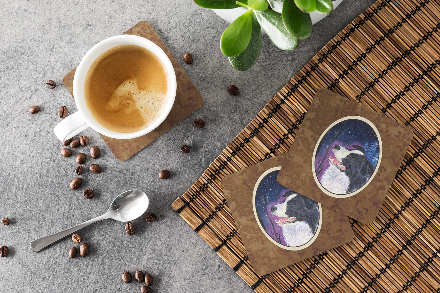 Decorate your space with our Border Collie artwork on a Coaster set. Presenting our Set of 4 Foam Coasters, a stylish and practical addition to your table setting. Each square coaster, measuring 3 1/2 inches by 3 1/2 inches, is perfectly sized to accommodate various drinkware, from coffee mugs to tumblers. These coasters stand out with their full-color artwork, permanently dyed onto the material for a vibrant and fade-resistant finish. They're not just functional, they're a fashionable statement, adding a touch of flair to any gathering or event. Our foam coasters serve a dual purpose - they protect your table from water stains and are perfect for both hot and cold drinks. The material used is similar to that of our high-quality mouse pads, ensuring durability and heat resistance. These coasters are easy to maintain - simply wash them in the top of your dishwasher and lay flat to dry. The design won't come off, ensuring they retain their vivid colors for years. Pair them with one of our insulated coolers or huggers for a cohesive, thoughtful gift set. Enhance your beverage experience with our Set of 4 Foam Coasters.
