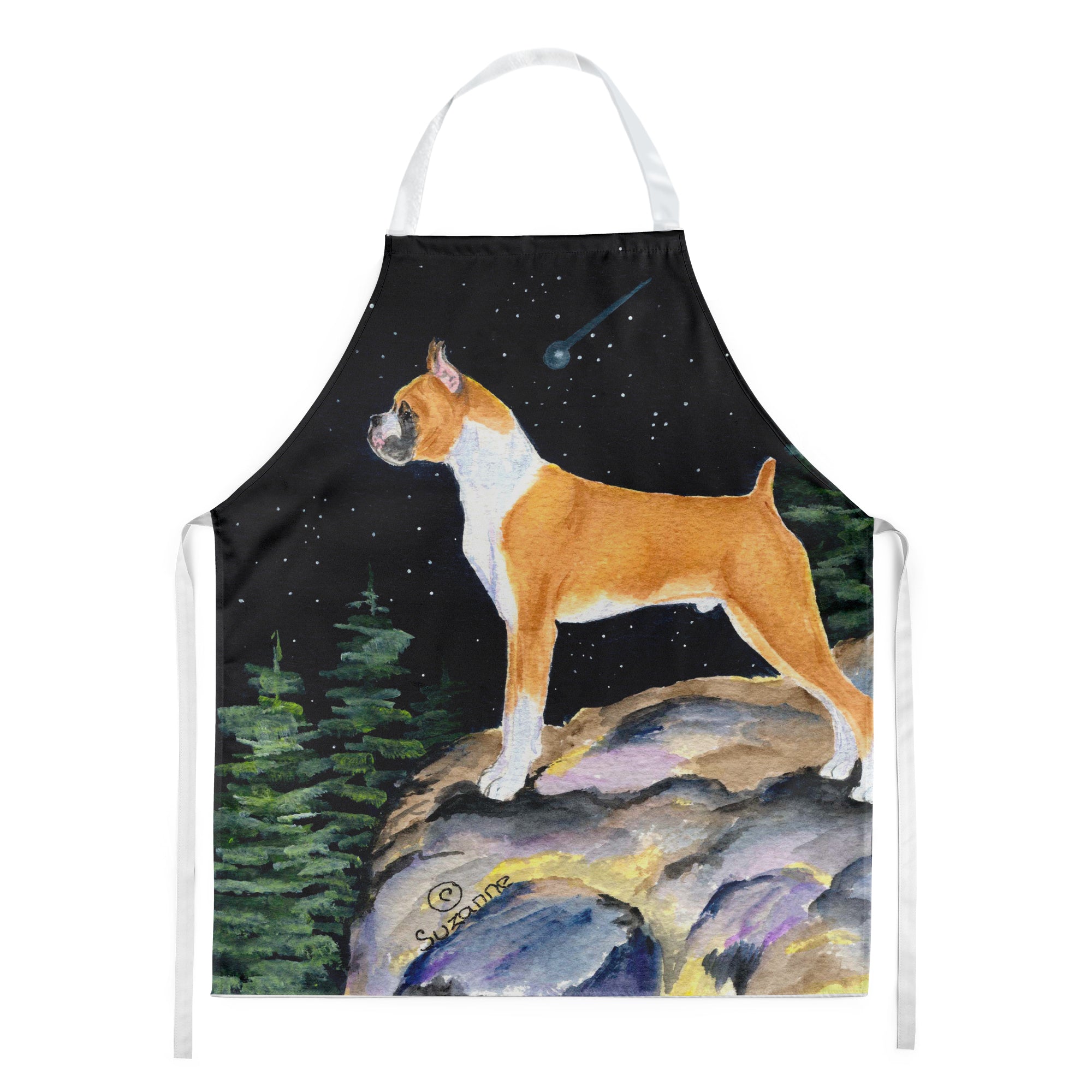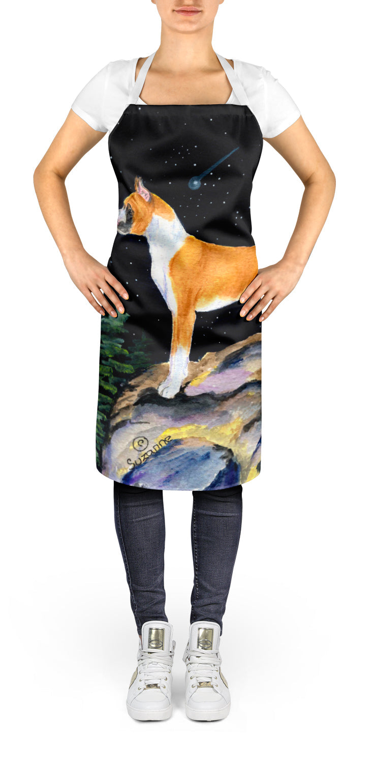 Decorate your space with our Boxer artwork on a Apron. Elevate your cooking, baking, and grilling experiences with our versatile Kitchen or BBQ Apron. This Bib Style apron isn't just limited to culinary activities - it also serves as an excellent baking apron, artist apron, server apron, gardening apron, or even a dog grooming apron. The apron showcases vibrant full-color artwork contributed by one of our talented artists, bringing a dash of style to your daily tasks. With dimensions of approximately 27"W x 30"H, it provides ample coverage to protect your clothing from spills and splashes. Our apron is meticulously crafted from 100% Ultra Spun Polyester, known for its durability and lightweight nature. The apron comes with white tie straps, ensuring a comfortable and adjustable fit for all. It's a perfect choice for kitchen apron enthusiasts, whether you are a woman or a man. Designed for easy maintenance, this apron is fully machine washable. The quick-drying polyester material actively reduces staining, keeping your apron looking fresh and new for longer. Our beautifully designed apron isn't just a functional kitchen accessory - it's a fashion statement in the culinary world!