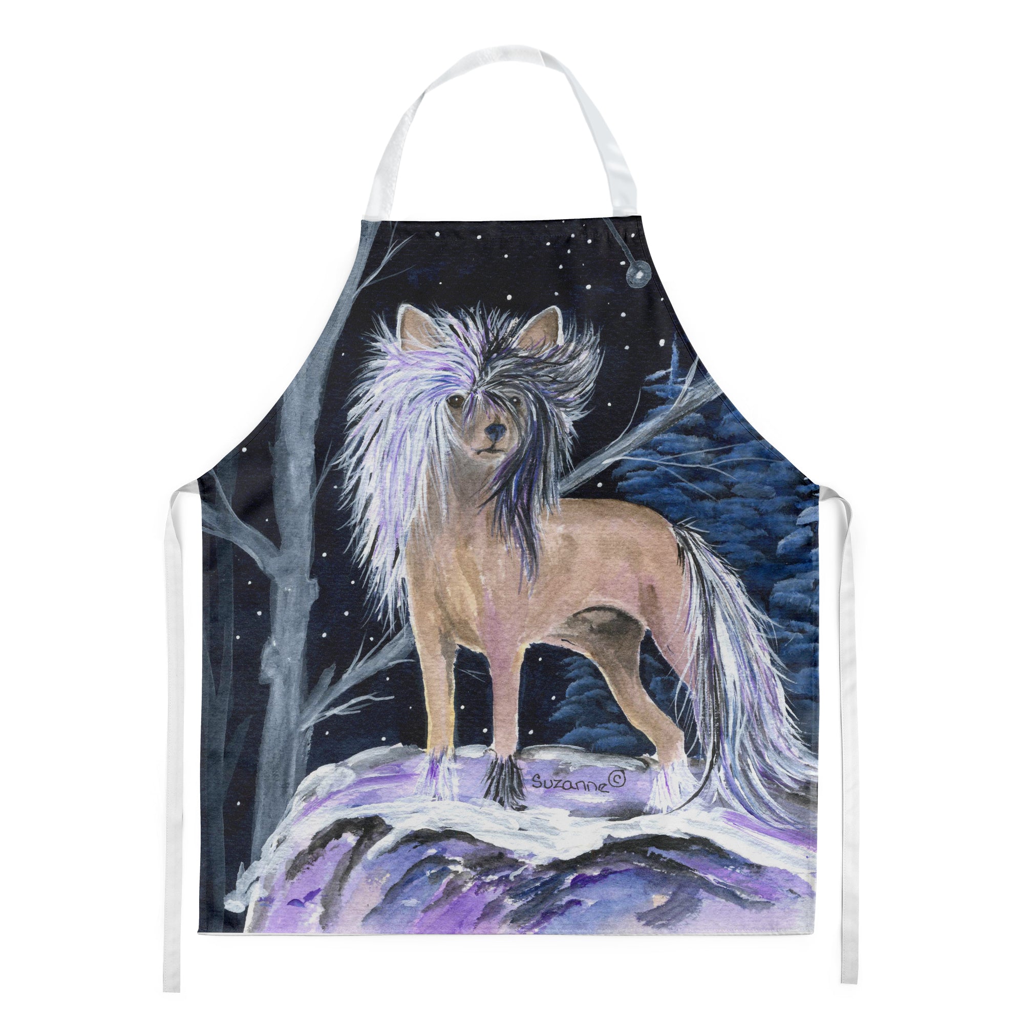 Decorate your space with our Chinese Crested artwork on a Apron. Elevate your cooking, baking, and grilling experiences with our versatile Kitchen or BBQ Apron. This Bib Style apron isn't just limited to culinary activities - it also serves as an excellent baking apron, artist apron, server apron, gardening apron, or even a dog grooming apron. The apron showcases vibrant full-color artwork contributed by one of our talented artists, bringing a dash of style to your daily tasks. With dimensions of approximately 27"W x 30"H, it provides ample coverage to protect your clothing from spills and splashes. Our apron is meticulously crafted from 100% Ultra Spun Polyester, known for its durability and lightweight nature. The apron comes with white tie straps, ensuring a comfortable and adjustable fit for all. It's a perfect choice for kitchen apron enthusiasts, whether you are a woman or a man. Designed for easy maintenance, this apron is fully machine washable. The quick-drying polyester material actively reduces staining, keeping your apron looking fresh and new for longer. Our beautifully designed apron isn't just a functional kitchen accessory - it's a fashion statement in the culinary world!