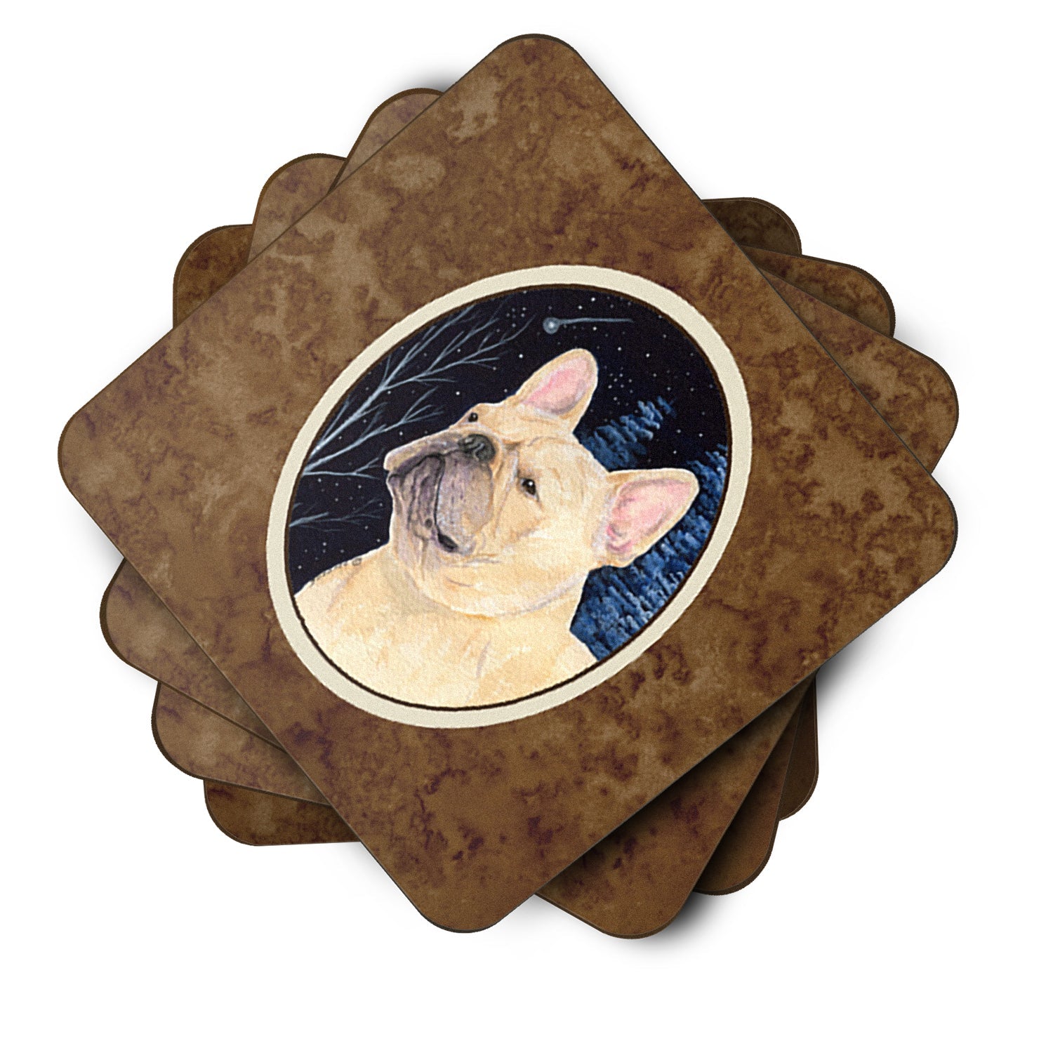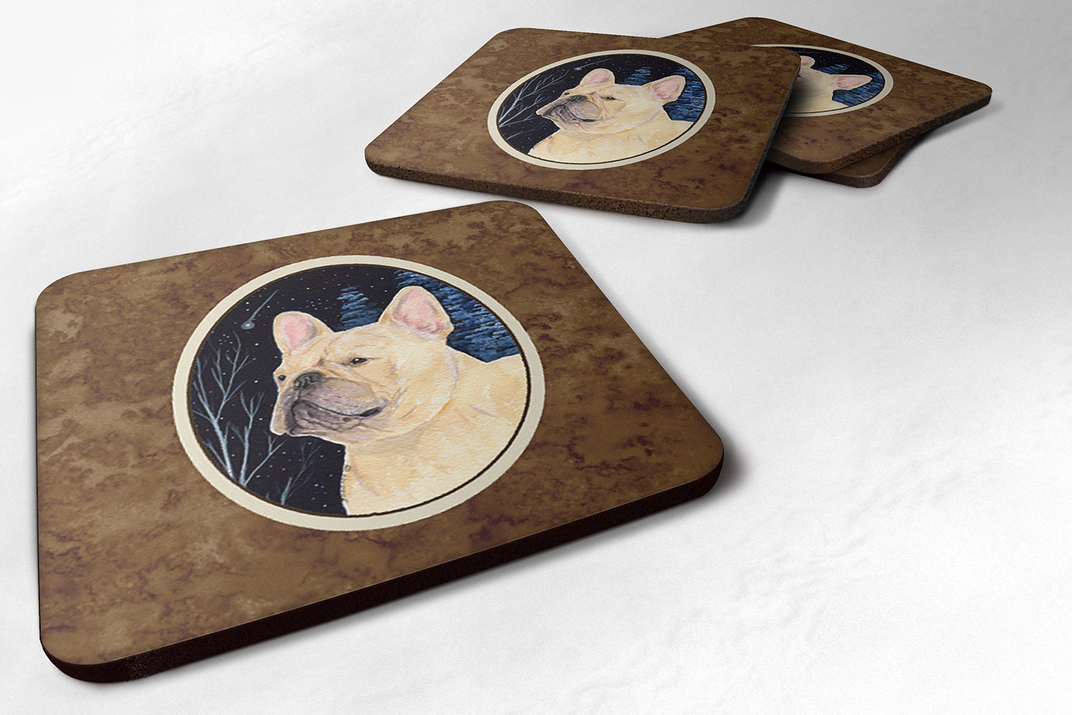 Decorate your space with our French Bulldog artwork on a Coaster set. Presenting our Set of 4 Foam Coasters, a stylish and practical addition to your table setting. Each square coaster, measuring 3 1/2 inches by 3 1/2 inches, is perfectly sized to accommodate various drinkware, from coffee mugs to tumblers. These coasters stand out with their full-color artwork, permanently dyed onto the material for a vibrant and fade-resistant finish. They're not just functional, they're a fashionable statement, adding a touch of flair to any gathering or event. Our foam coasters serve a dual purpose - they protect your table from water stains and are perfect for both hot and cold drinks. The material used is similar to that of our high-quality mouse pads, ensuring durability and heat resistance. These coasters are easy to maintain - simply wash them in the top of your dishwasher and lay flat to dry. The design won't come off, ensuring they retain their vivid colors for years. Pair them with one of our insulated coolers or huggers for a cohesive, thoughtful gift set. Enhance your beverage experience with our Set of 4 Foam Coasters.