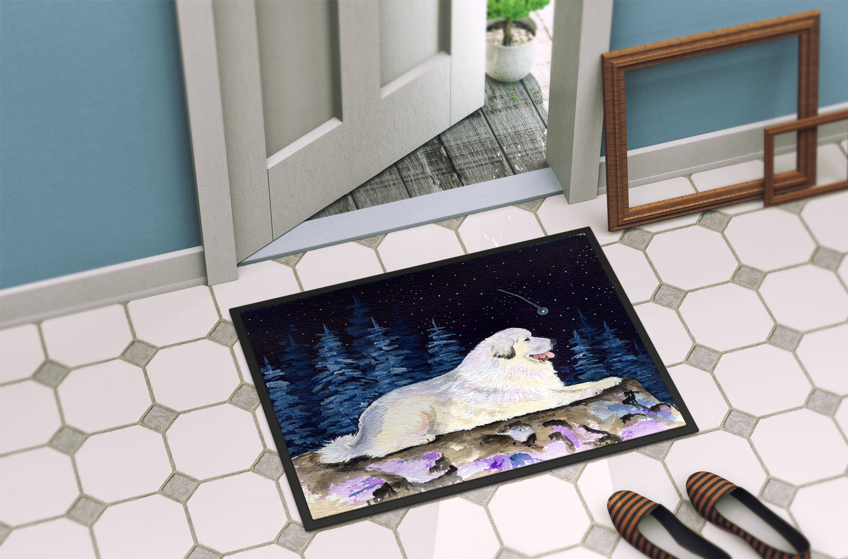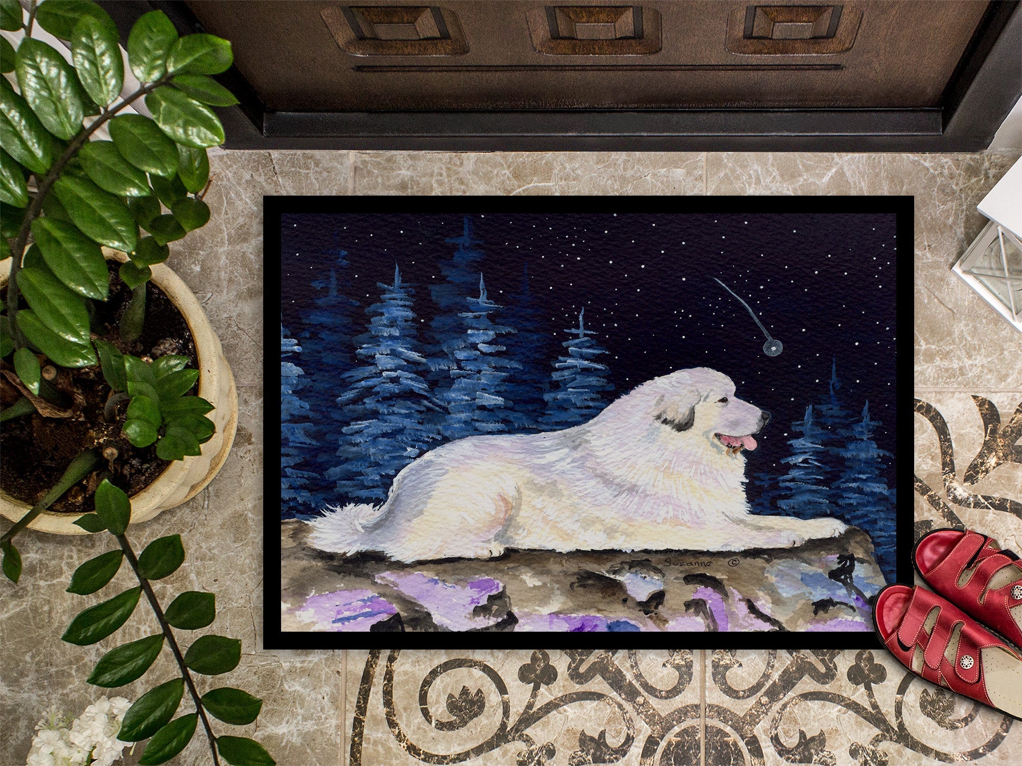 Decorate your space with our Great Pyrenees artwork on a Doormat. Welcome your guests in style with our Artwork Door Mat, designed to withstand almost any weather condition. This mat, measuring approximately 24 by 36 inches, is held together by durable black binding tape. Its top layer, composed of polyester felt, is dyed with the eye-catching image you see on the mat. A few layers below provide the mat with stability, while its rubber bottom is stamped to help prevent slipping and ensures safety. Our mat works wonderfully as both an indoor or outdoor door mat. For cleaning, simply hose it off with water or use a power washer - no need for any cleaner that produces suds. Avoid scrubbing with a brush, instead, opt for the vacuum on floor setting. Designed manufactured and printed in the USA, this mat is a perfect addition to your porch, outdoor kitchen, entryway, or any indoor space. Its unique design makes it a charming decorative rug that greets your guests and adds a stylish touch to your home decor.