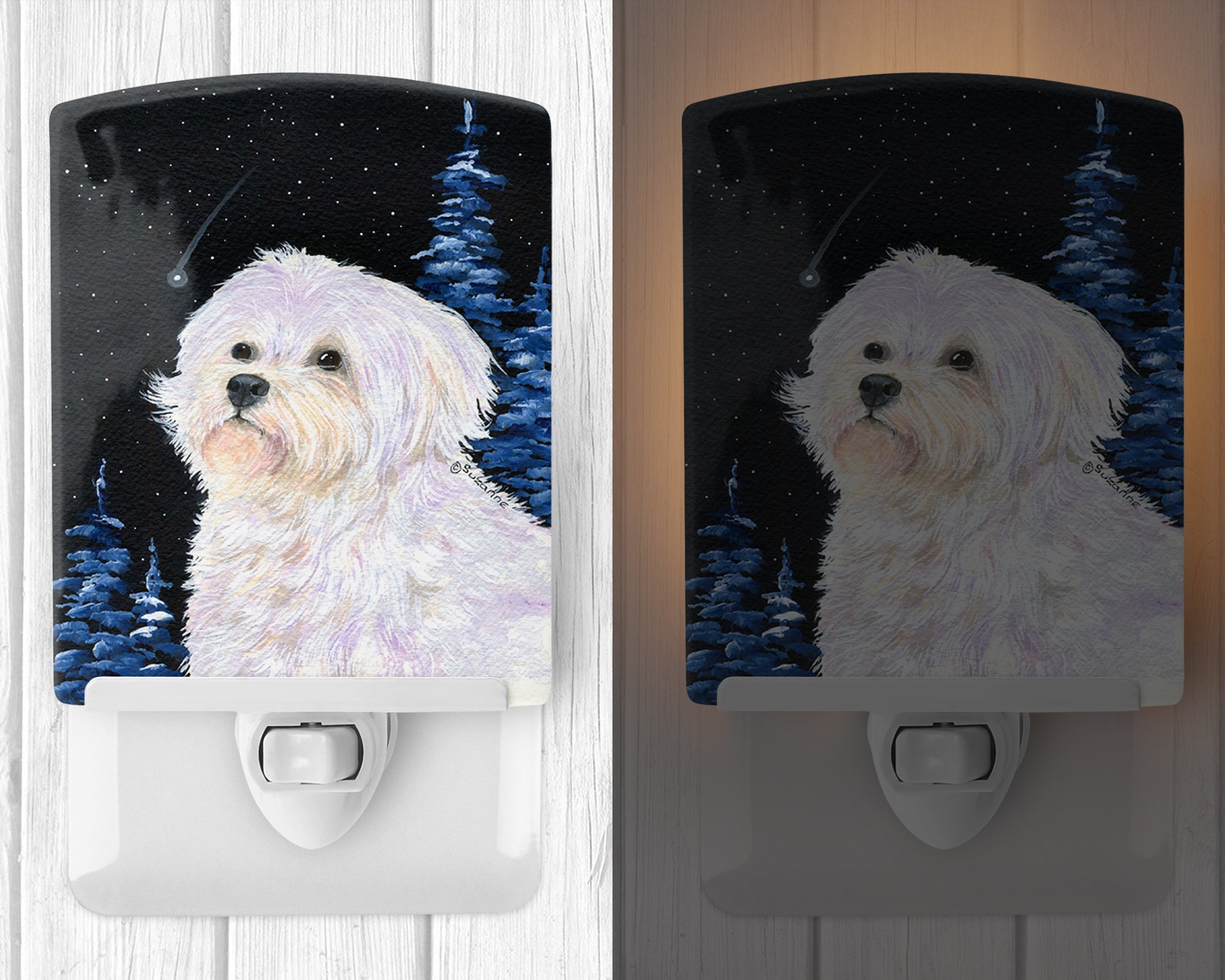 Decorate your space with our Maltese artwork on a Night Light. Introduce a splash of artistic flair and subtle illumination to your space with the Decorative Ceramic Night Light from Caroline's Treasures. Perfect for any room, this night light seamlessly blends functionality with an aesthetic appeal, offering a stylish solution to brighten up dark corners of your home or office. Boasting a six-inch high by four-inch wide ceramic tile at the front, it showcases vivid, full-color artwork from distinguished artists, transforming a simple utility into a vibrant art piece. The artwork is securely encased in a robust metal holder, ensuring durability and longevity. Two screws are provided to firmly affix the tile into the holder. The holder extends three inches deep, housing an included bulb that emits a soft, welcoming glow. This product meets all safety standards, as evidenced by its UL approval. Proudly made in the United States from imported components, this Decorative Ceramic Night Light is not just a functional device; it's a statement piece that enhances the ambiance of your surroundings.