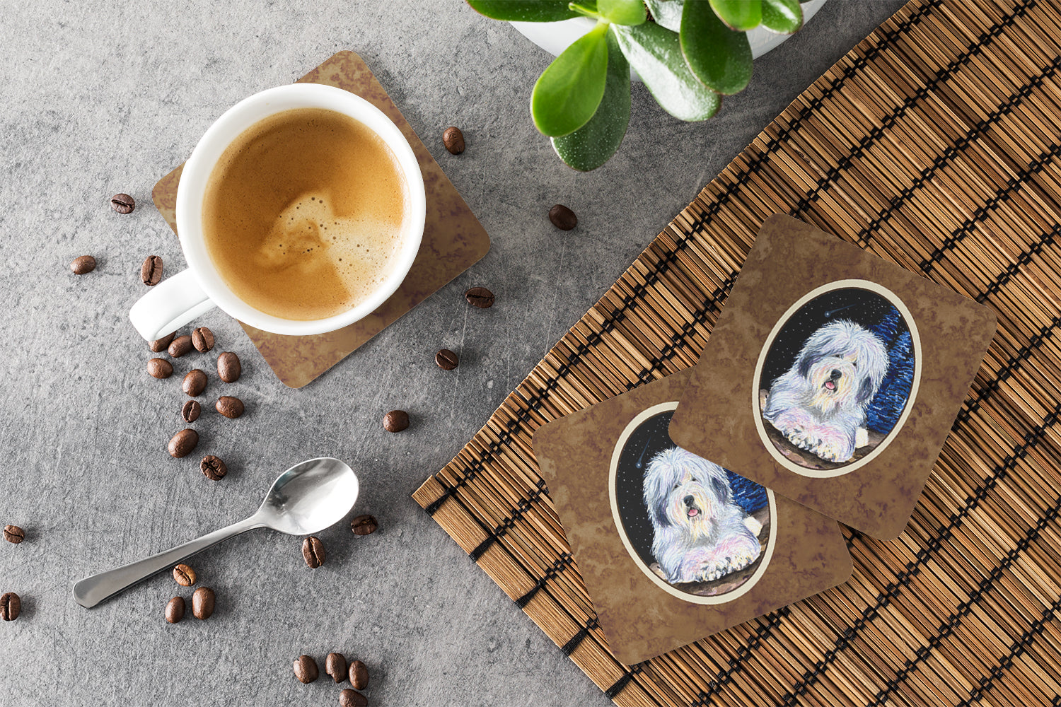 Decorate your space with our Old English Sheepdog artwork on a Coaster set. Presenting our Set of 4 Foam Coasters, a stylish and practical addition to your table setting. Each square coaster, measuring 3 1/2 inches by 3 1/2 inches, is perfectly sized to accommodate various drinkware, from coffee mugs to tumblers. These coasters stand out with their full-color artwork, permanently dyed onto the material for a vibrant and fade-resistant finish. They're not just functional, they're a fashionable statement, adding a touch of flair to any gathering or event. Our foam coasters serve a dual purpose - they protect your table from water stains and are perfect for both hot and cold drinks. The material used is similar to that of our high-quality mouse pads, ensuring durability and heat resistance. These coasters are easy to maintain - simply wash them in the top of your dishwasher and lay flat to dry. The design won't come off, ensuring they retain their vivid colors for years. Pair them with one of our insulated coolers or huggers for a cohesive, thoughtful gift set. Enhance your beverage experience with our Set of 4 Foam Coasters.