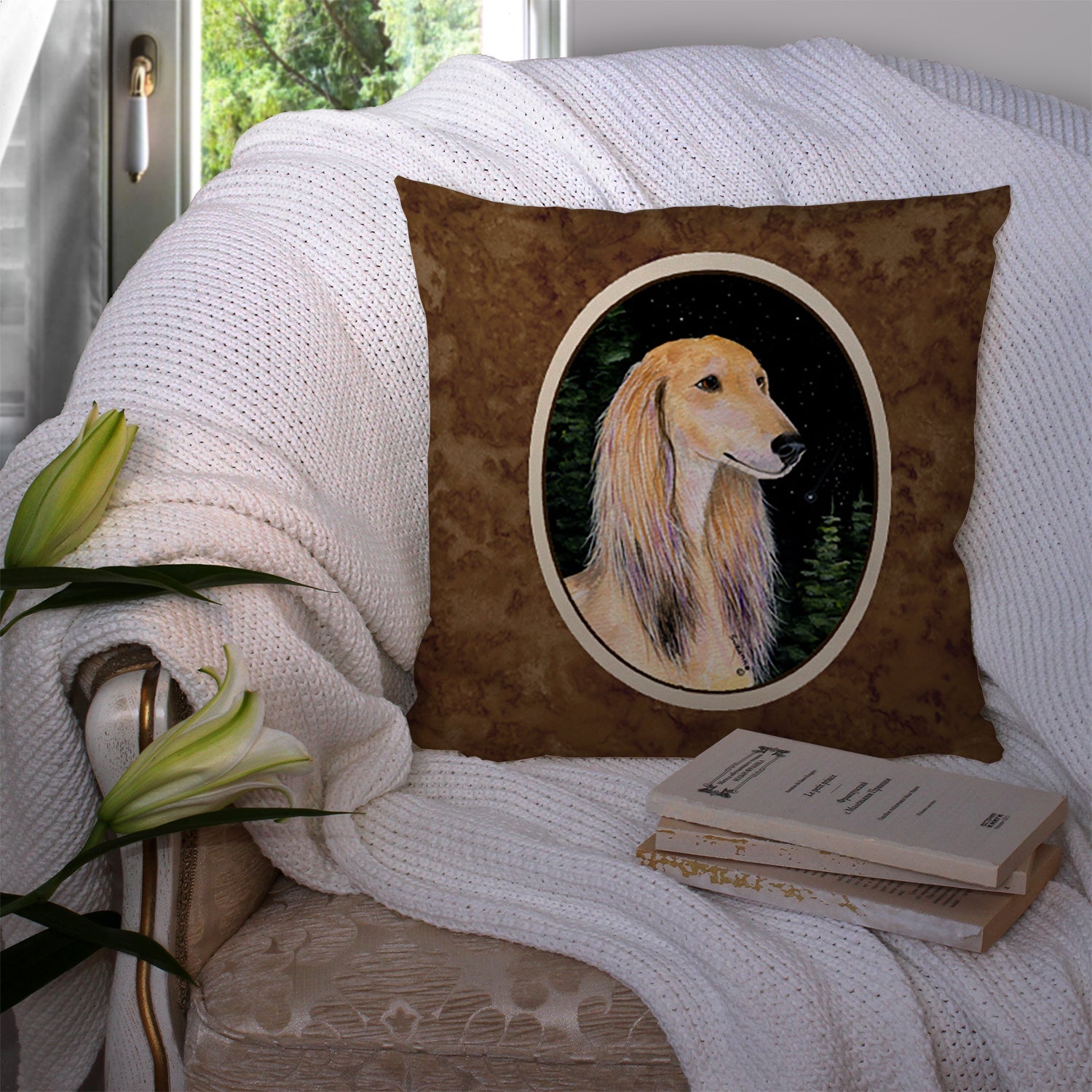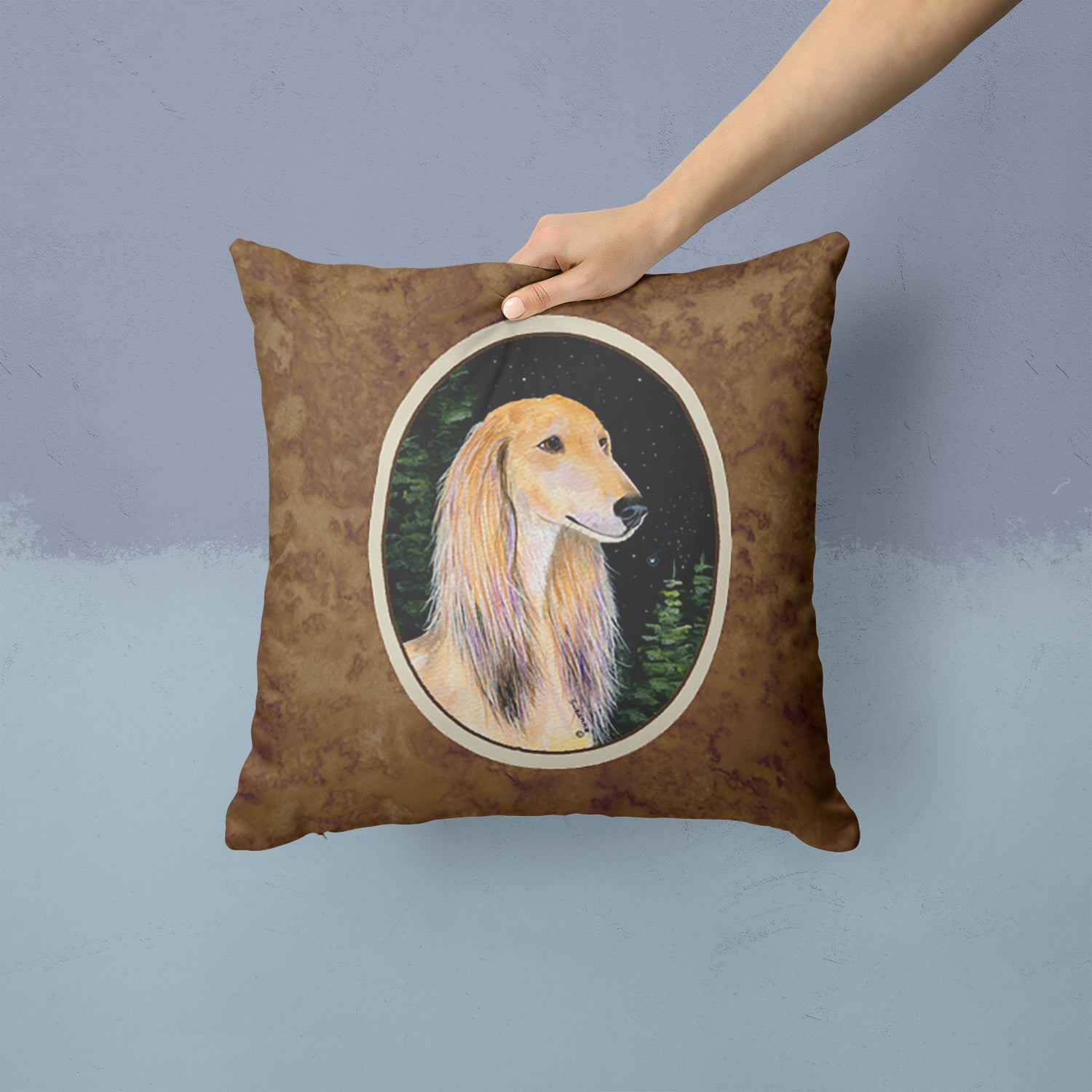 Decorate your space with our Saluki artwork on a Pillow. Add a touch of vibrancy and comfort to your outdoor seating with Caroline's Treasures Fabric Decorative Pillow. Measuring approximately 14 inches by 14 inches, this outdoor pillow is crafted to elevate the appeal of your patio furniture, infusing it with vivid color and artistic flair. The pillow includes a 100% Polyester Fabric sham filled with a quality pillow form to provide superior comfort. Innovatively made from our brand new material, specifically woven for its water resistance, this pillow is designed for durability. The soft canvas fabric offers versatility in use, fit for your indoor couch or your outdoor patio, porch, or veranda. The fabric is dyed with colorfast dyes built for resilience against weather conditions, ensuring the pillow retains its beauty over time. Constructed by sewing three fabric pieces to create a sham, the polyester insert is then nestled inside to form the pillow, resulting in an overstuffed pillow that maintains its shape. Both the sham and the pillow insert are proudly made in the United States. As the pillows are handcrafted, there may be minor variations in size, further enhancing their unique charm. Experience comfort in style with Caroline's Treasures Fabric Decorative Pillow.