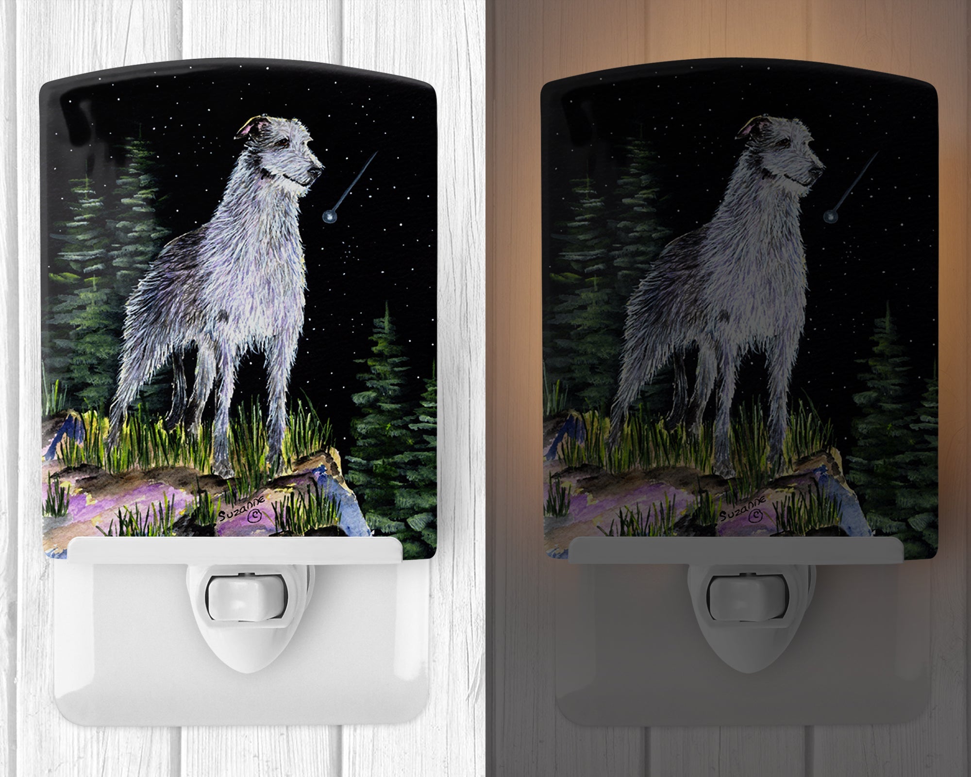 Decorate your space with our Scottish Deerhound artwork on a Night Light. Introduce a splash of artistic flair and subtle illumination to your space with the Decorative Ceramic Night Light from Caroline's Treasures. Perfect for any room, this night light seamlessly blends functionality with an aesthetic appeal, offering a stylish solution to brighten up dark corners of your home or office. Boasting a six-inch high by four-inch wide ceramic tile at the front, it showcases vivid, full-color artwork from distinguished artists, transforming a simple utility into a vibrant art piece. The artwork is securely encased in a robust metal holder, ensuring durability and longevity. Two screws are provided to firmly affix the tile into the holder. The holder extends three inches deep, housing an included bulb that emits a soft, welcoming glow. This product meets all safety standards, as evidenced by its UL approval. Proudly made in the United States from imported components, this Decorative Ceramic Night Light is not just a functional device; it's a statement piece that enhances the ambiance of your surroundings.