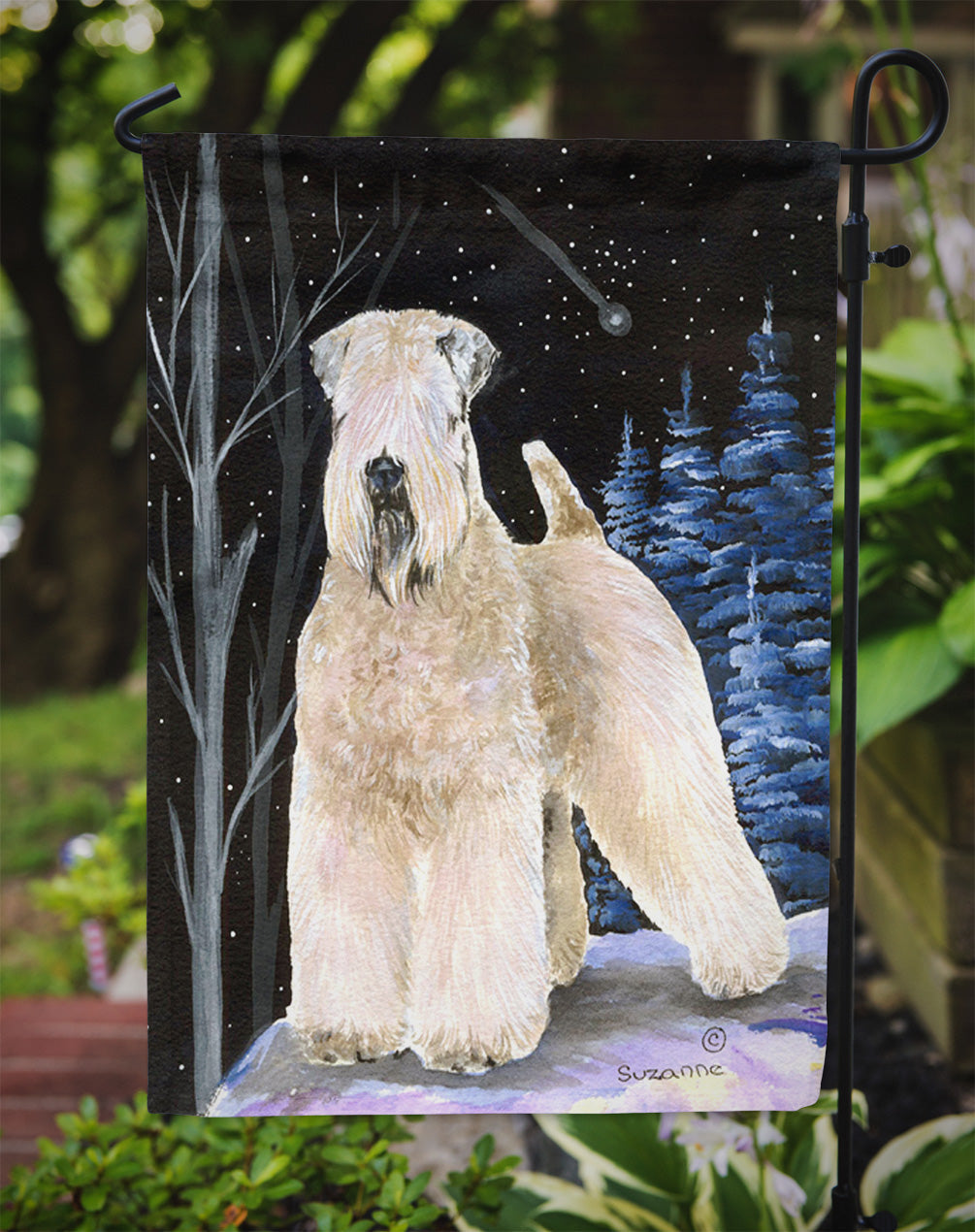 Decorate your space with our Wheaten Terrier artwork on a Garden Flag. Enhance the beauty of your garden, patio, or yard with Caroline's Treasures Decorative Garden Flag, proudly made in the USA. Crafted from two pieces of thick, double-sided polyester fabric, this 2-ply garden flag is designed to withstand various weather conditions, making it water-resistant and weatherproof. Featuring correctly readable words on both sides, this garden flag offers a delightful visual experience from any angle. With its heavier weight, it stands out among other garden flags, ensuring stability and durability even in wind, rain, and snow. Measuring approximately 11 1/4 inches by 15 1/2 inches, this flag allows you to personalize your outdoor decor. It comes with a 1 1/2-inch sleeve sewn in, allowing easy attachment to any standard garden flag stand or garden size porch hanger (sold separately). Make a statement in your outdoor space with Caroline's Treasures Decorative Garden Flag, a vibrant and high-quality flag that adds color and personality to your surroundings. Proudly made in the USA, it's a symbol of quality craftsmanship and attention to detail.
