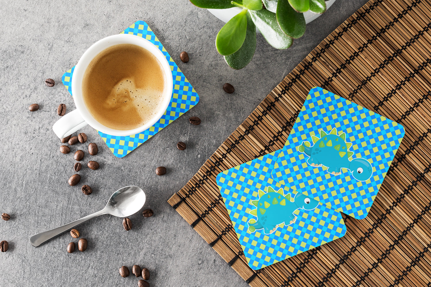Decorate your space with our Stegosaurus artwork on a Coaster set. Presenting our Set of 4 Foam Coasters, a stylish and practical addition to your table setting. Each square coaster, measuring 3 1/2 inches by 3 1/2 inches, is perfectly sized to accommodate various drinkware, from coffee mugs to tumblers. These coasters stand out with their full-color artwork, permanently dyed onto the material for a vibrant and fade-resistant finish. They're not just functional, they're a fashionable statement, adding a touch of flair to any gathering or event. Our foam coasters serve a dual purpose - they protect your table from water stains and are perfect for both hot and cold drinks. The material used is similar to that of our high-quality mouse pads, ensuring durability and heat resistance. These coasters are easy to maintain - simply wash them in the top of your dishwasher and lay flat to dry. The design won't come off, ensuring they retain their vivid colors for years. Pair them with one of our insulated coolers or huggers for a cohesive, thoughtful gift set. Enhance your beverage experience with our Set of 4 Foam Coasters.