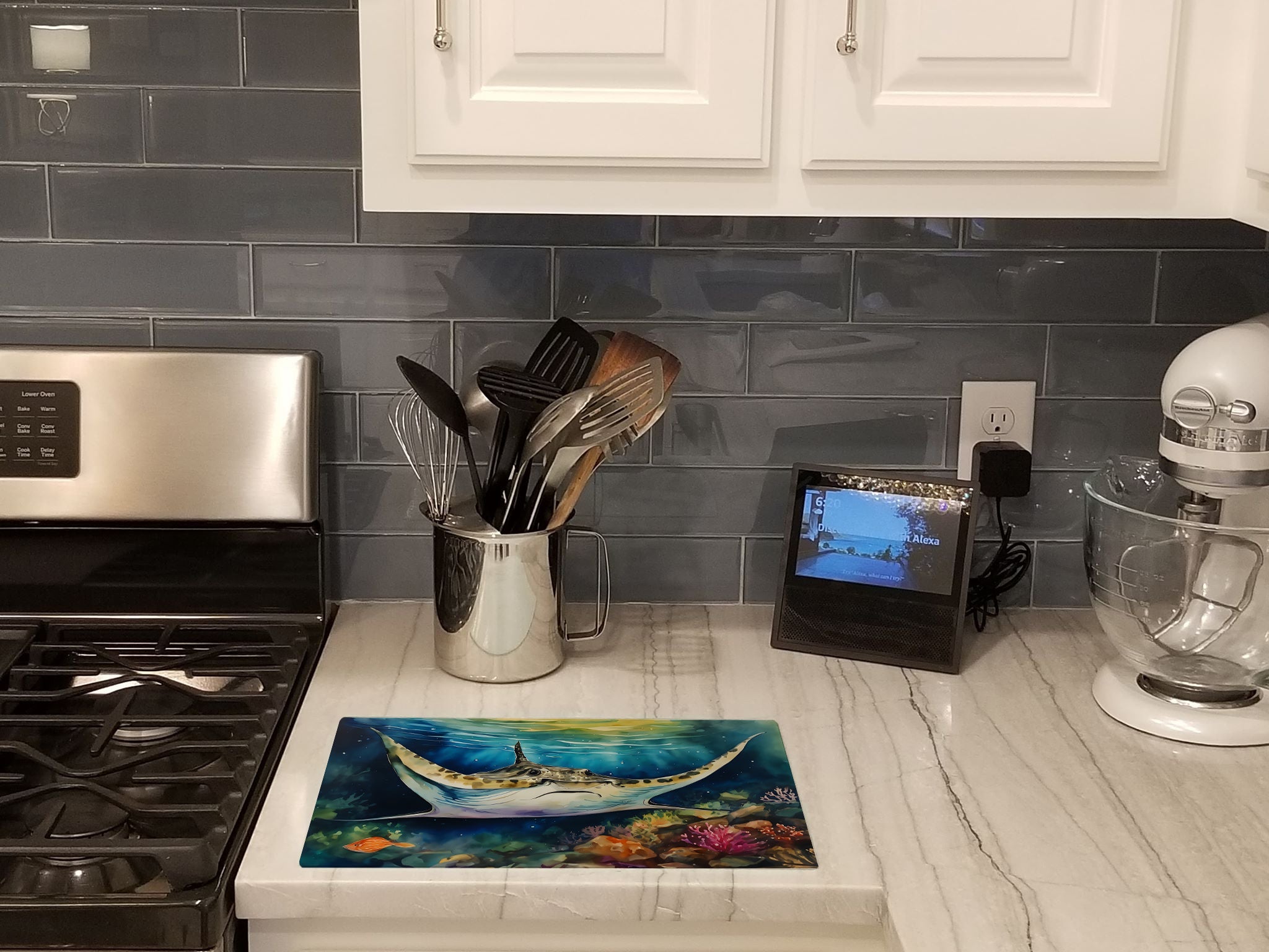 Decorate your space with our Sting Ray artwork on a Cutting Board. Introduce your kitchen to the vibrant, large Decorative Glass Cutting Board from Caroline's Treasures. Crafted from resilient tempered glass, this board is not only a utilitarian necessity but also a colorful art piece. With its generous dimensions of 15 inches in height and 12 inches in length, it offers ample space for all your cutting needs. Every piece showcases captivating artwork from distinguished artists, bringing an aesthetic edge to your kitchen. Beyond its attractive design, this cutting board ensures your countertop stays pristine and unscathed, owing to its heat-resistant properties. Engineered with user convenience in mind, it features non-skid feet for stability, and rounded corners for additional safety. Its robust construction renders it virtually unbreakable, guaranteeing longevity. The board comes with protective feet bumpers, maintaining its position during use. This product is recommended to be hand washed only. Proudly printed and assembled in the United States, this cutting board exemplifies superior craftsmanship. With Caroline's Treasures' Decorative Glass Cutting Board, you're investing in a blend of functionality and artistic flair.