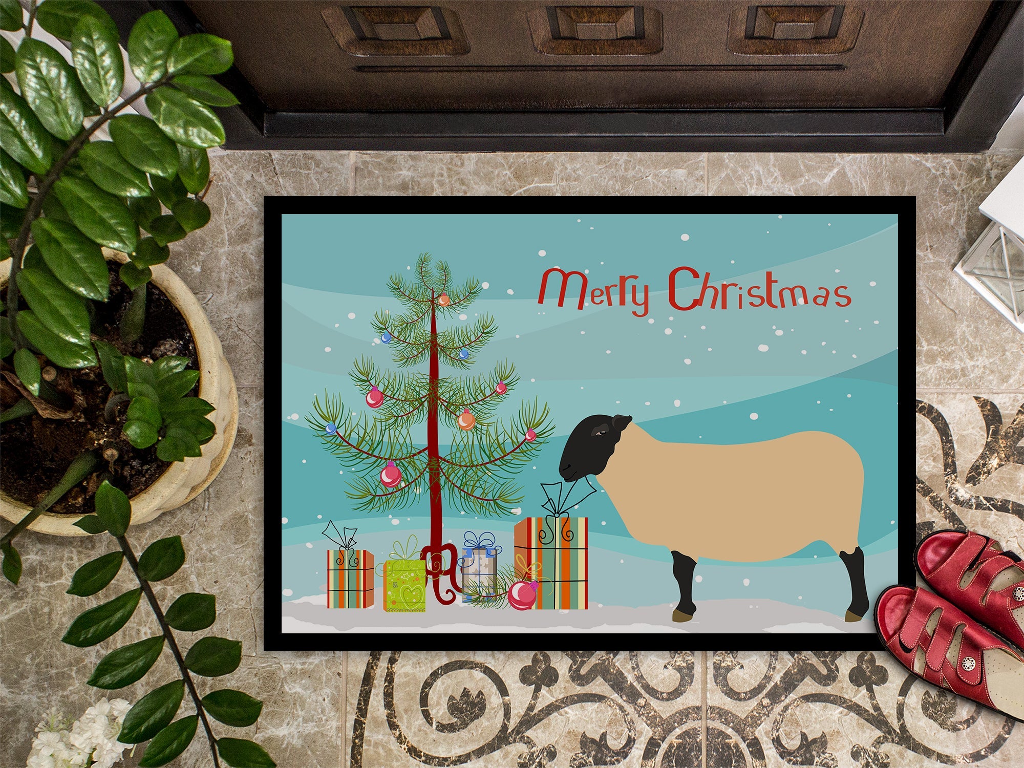 Decorate your space with our Christmas Suffolk Sheep artwork on a Doormat. Welcome your guests in style with our Artwork Door Mat, designed to withstand almost any weather condition. This mat, measuring approximately 18 by 27 inches, is held together by durable black binding tape. Its top layer, composed of polyester felt, is dyed with the eye-catching image you see on the mat. A few layers below provide the mat with stability, while its rubber bottom is stamped to help prevent slipping and ensures safety. Our mat works wonderfully as both an indoor or outdoor door mat. For cleaning, simply hose it off with water or use a power washer - no need for any cleaner that produces suds. Avoid scrubbing with a brush, instead, opt for the vacuum on floor setting. Designed manufactured and printed in the USA, this mat is a perfect addition to your porch, outdoor kitchen, entryway, or any indoor space. Its unique design makes it a charming decorative rug that greets your guests and adds a stylish touch to your home decor.