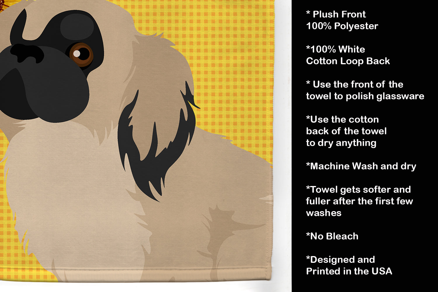 Decorate your space with our Pekingese artwork on a Kitchen Towel. Bring a bit of Summer into your home with a Summer Kitchen Towel. Experience the perfect blend of aesthetic appeal and functional excellence with our Plush Velour Kitchen Towels. These are not your ordinary decorative kitchen towels that gather dust. Instead, they are designed to be as practical as they are stylish. The front layer of our towel is constructed from a minky plush polyester, known for its durability and color retention. Unlike conventional kitchen towels, the artwork on our towels is dyed directly into the fabric, ensuring vibrant colors that last. Polish your glassware to a brilliant sparkle using the plush front side of the towel. Flip to the back, crafted from 100% cotton terry loop, to exploit its exceptional absorbency for drying dishes or wiping down counters. Our kitchen towels redefine the concept of functional art, offering lasting quality that maintains the towel's shape over time. Measuring 15 inches by 25 inches and weighing 2.3 lbs per dozen, these towels deliver an overwhelming sensory experience with their soft, plush, and smooth texture. The edges are meticulously finished with binding, enhancing their durability and visual appeal. For your convenience, these towels are machine washable and can be dried on low heat. After the first wash, the top fabric becomes even softer and fluffier, eliminating the need for ironing. Treat your kitchen to the luxury and functionality it deserves with our plush velour kitchen towels.