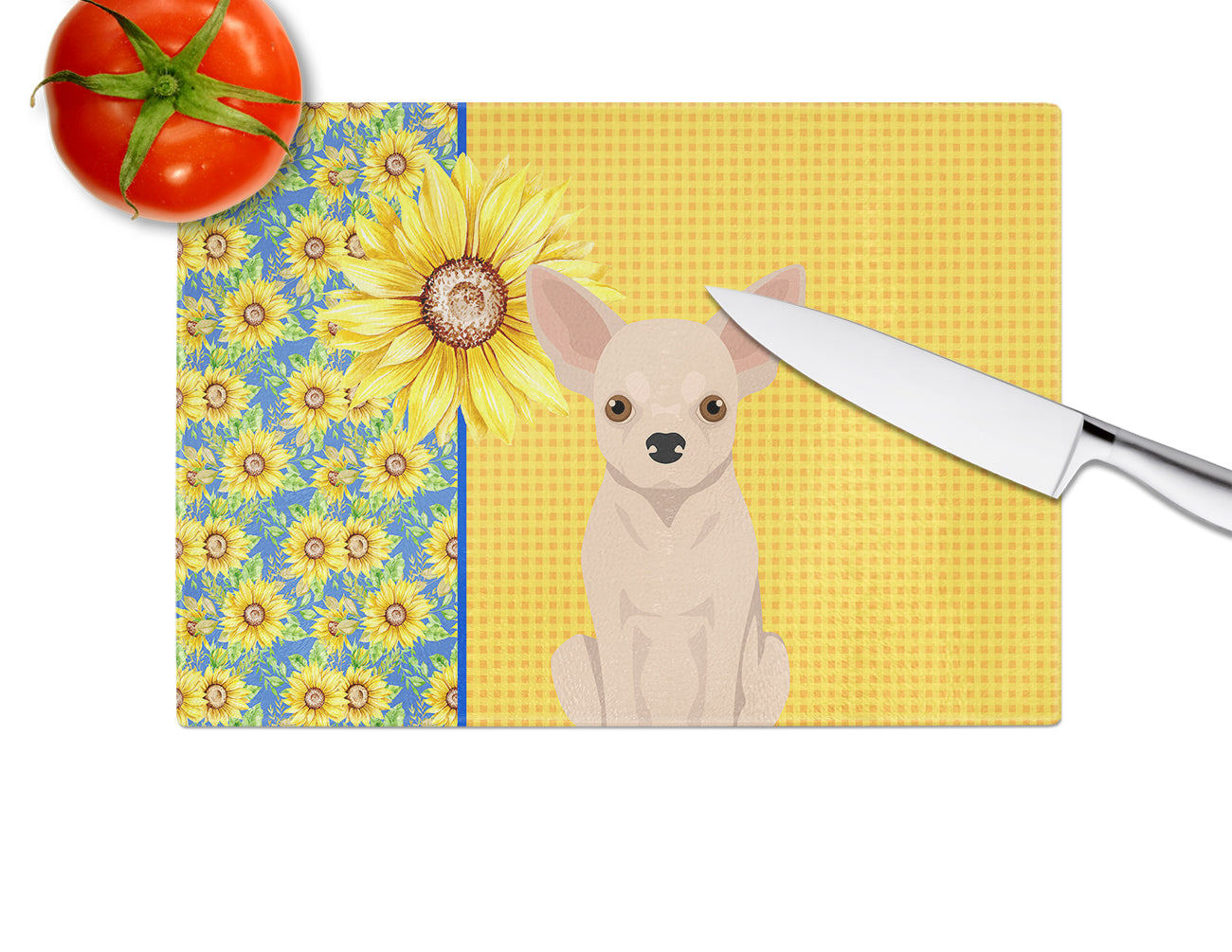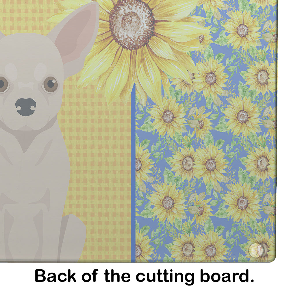 Summer Sunflowers Fawn Chihuahua Glass Cutting Boards – Durable, Decorative Kitchen Art Large