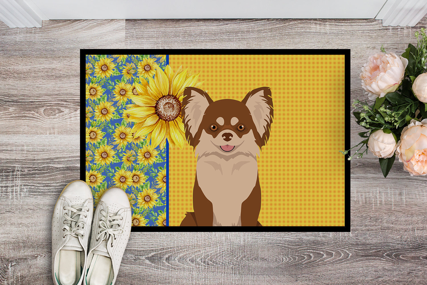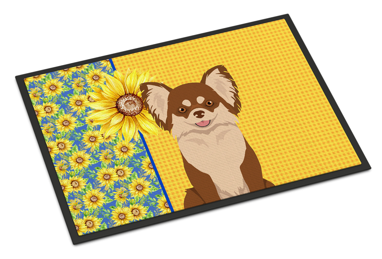 Summer Sunflowers Longhaired Chocolate and White Chihuahua Doormat - 18x27 Decorative Floor Mat – Indoor/Outdoor Rug with Artistic Flair