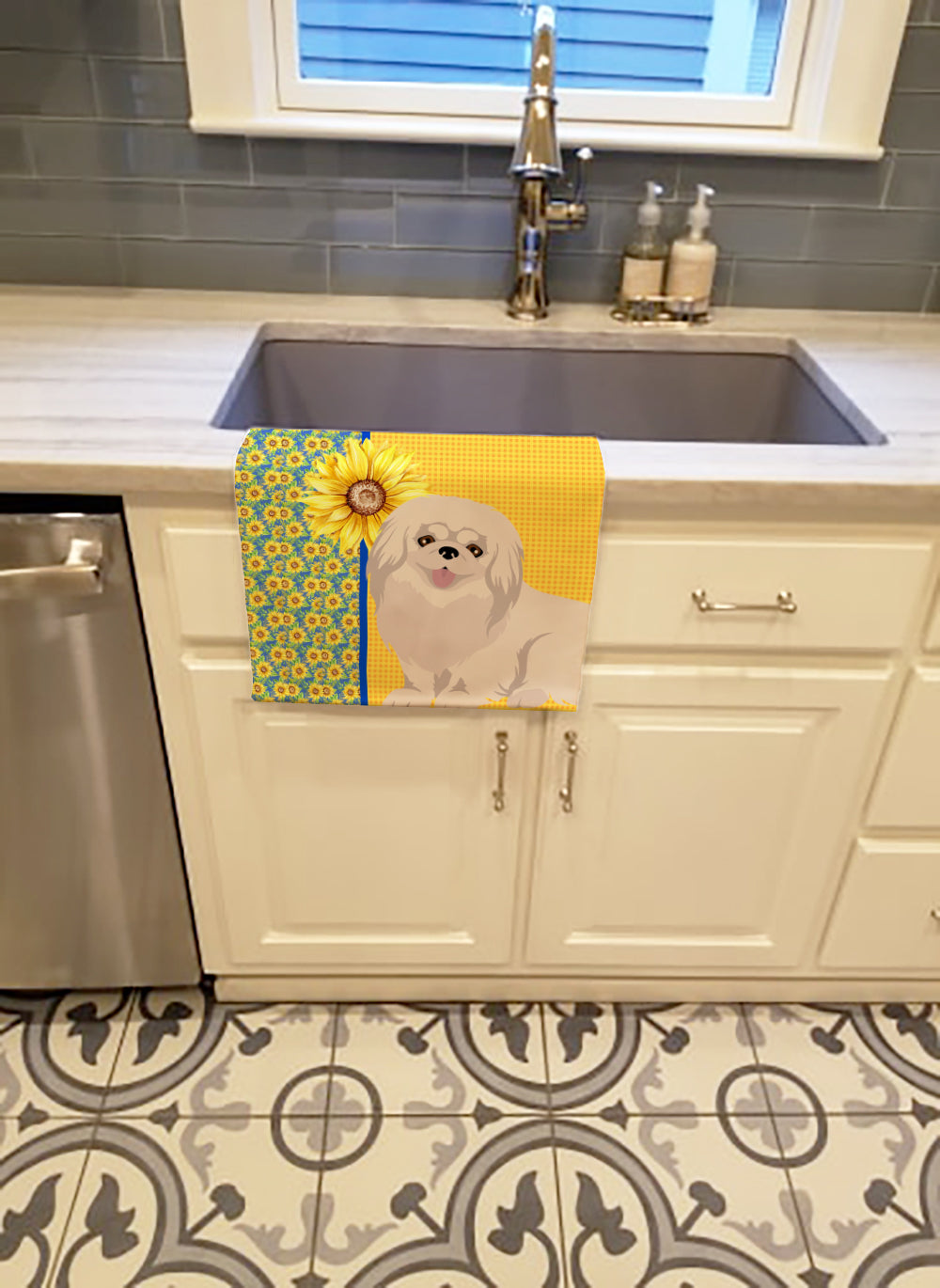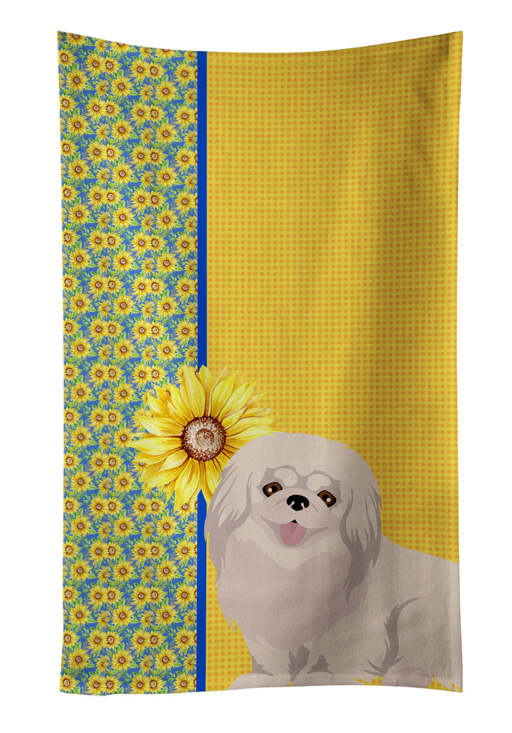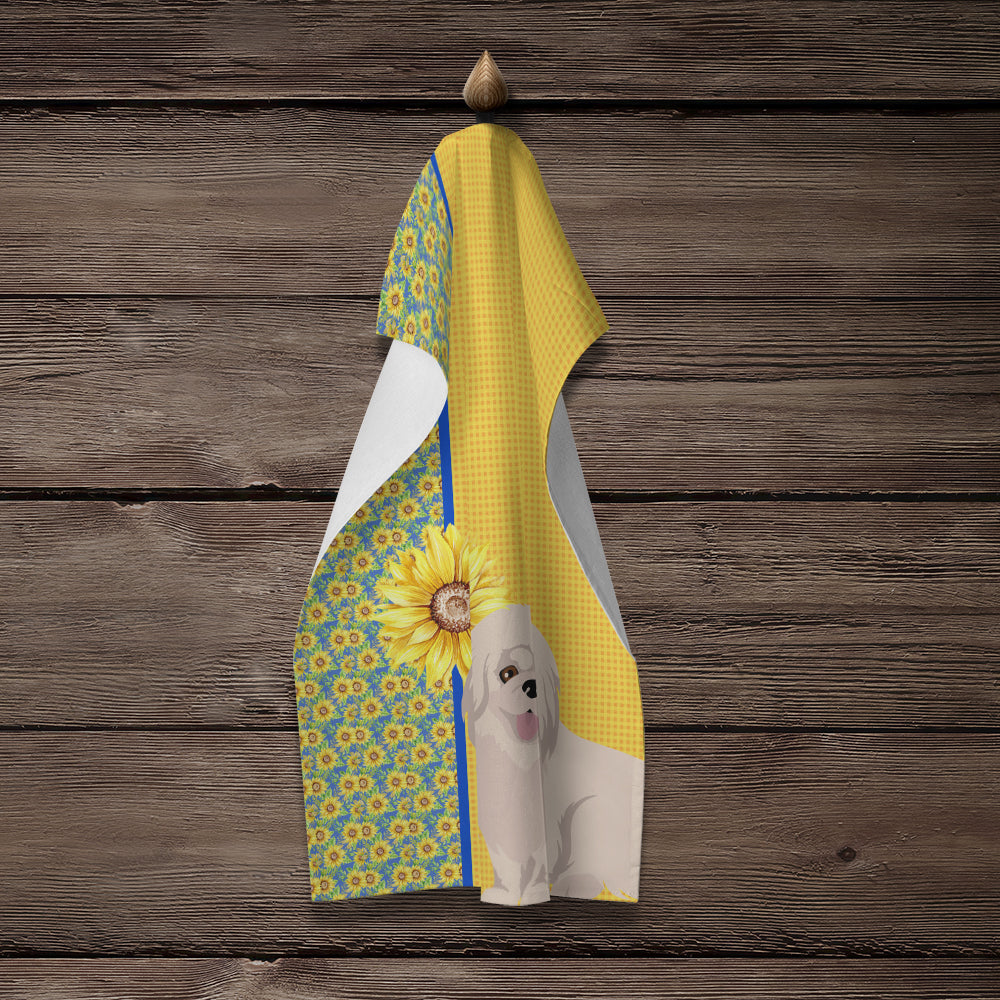 Summer Sunflowers White Pekingese Kitchen Towel