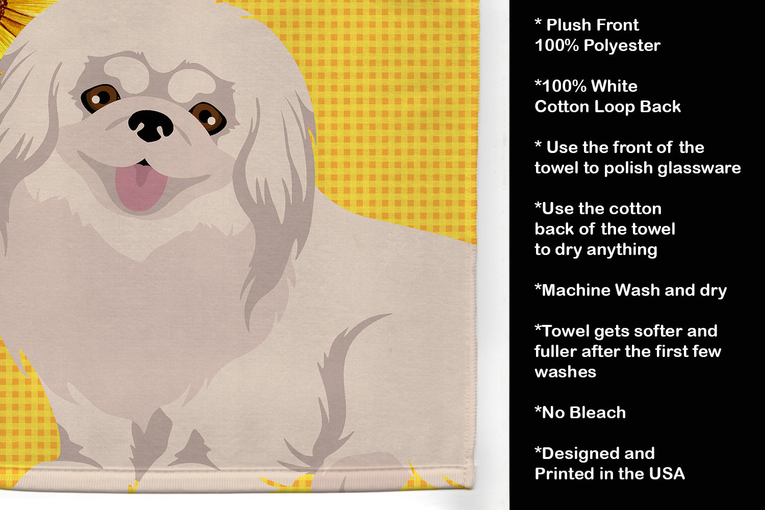 Decorate your space with our Pekingese artwork on a Kitchen Towel. Bring a bit of Summer into your home with a Summer Kitchen Towel. Experience the perfect blend of aesthetic appeal and functional excellence with our Plush Velour Kitchen Towels. These are not your ordinary decorative kitchen towels that gather dust. Instead, they are designed to be as practical as they are stylish. The front layer of our towel is constructed from a minky plush polyester, known for its durability and color retention. Unlike conventional kitchen towels, the artwork on our towels is dyed directly into the fabric, ensuring vibrant colors that last. Polish your glassware to a brilliant sparkle using the plush front side of the towel. Flip to the back, crafted from 100% cotton terry loop, to exploit its exceptional absorbency for drying dishes or wiping down counters. Our kitchen towels redefine the concept of functional art, offering lasting quality that maintains the towel's shape over time. Measuring 15 inches by 25 inches and weighing 2.3 lbs per dozen, these towels deliver an overwhelming sensory experience with their soft, plush, and smooth texture. The edges are meticulously finished with binding, enhancing their durability and visual appeal. For your convenience, these towels are machine washable and can be dried on low heat. After the first wash, the top fabric becomes even softer and fluffier, eliminating the need for ironing. Treat your kitchen to the luxury and functionality it deserves with our plush velour kitchen towels.