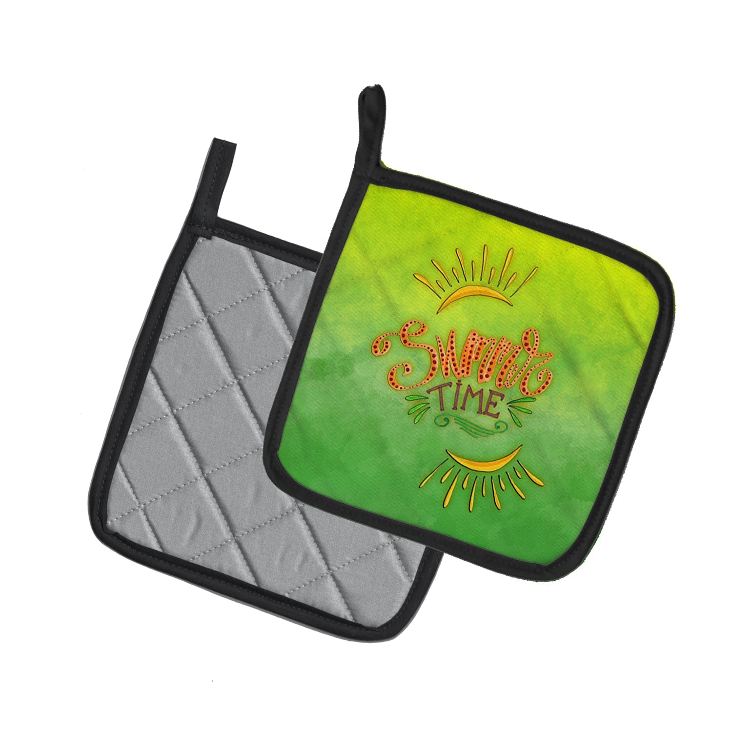 Bring a bit of Summer into your home with a Summer Pair of Pot Holders. A Pair of Pot Holders to match your kitchen decor. Made in the USA these are thick and functional. Full color artwork decorates the front polyester fabric of the hot pad and accented by a black trim. Use these at as a trivet for your Thanksgiving or Christmas tablescape. Filled with insulated fabric and quilted for durability. These colorful pot holders will make a great gift for your favorite home cook or executive chef. Each pot holder measures approximately 7 1/2 inches by 7 1/2 inches. A hanging tab is included.