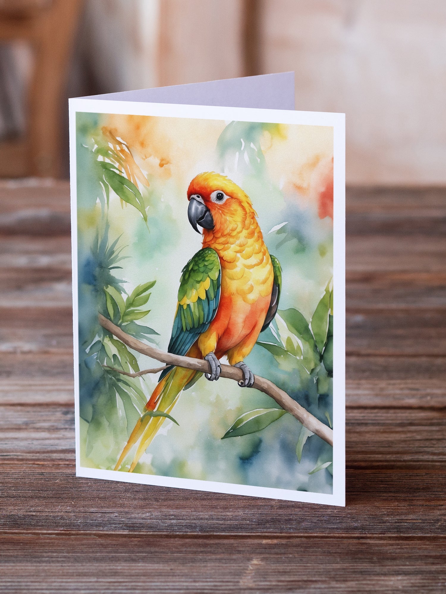Greeting Cards Pack of 8 featuring breed specific Sun Conure artwork. Celebrate special moments with Caroline's Treasures Printed Greeting Card Pack. This pack includes eight beautifully folded 5x7 cards, accompanied by eight matching white envelopes. With blank interiors, these cards provide ample space for your personalized messages and heartfelt holiday greetings. Each card features captivating full-color artwork, meticulously printed in our facility on high-quality 80 lb cover stock or 216 GSM. The super smooth finish of the white cards enhances the visual impact of the artwork, creating a truly stunning presentation. Designed by our talented in-house artists or licensed artists, the artwork on these cards showcases their creativity and attention to detail. From vibrant illustrations to captivating designs, each card tells its own unique story. Whether it's for birthdays, anniversaries, holidays, or any special occasion, Caroline's Treasures Greeting Card Pack is the perfect way to convey your heartfelt sentiments. Share joy, love, and warm wishes with these exquisite cards and make every moment unforgettable.