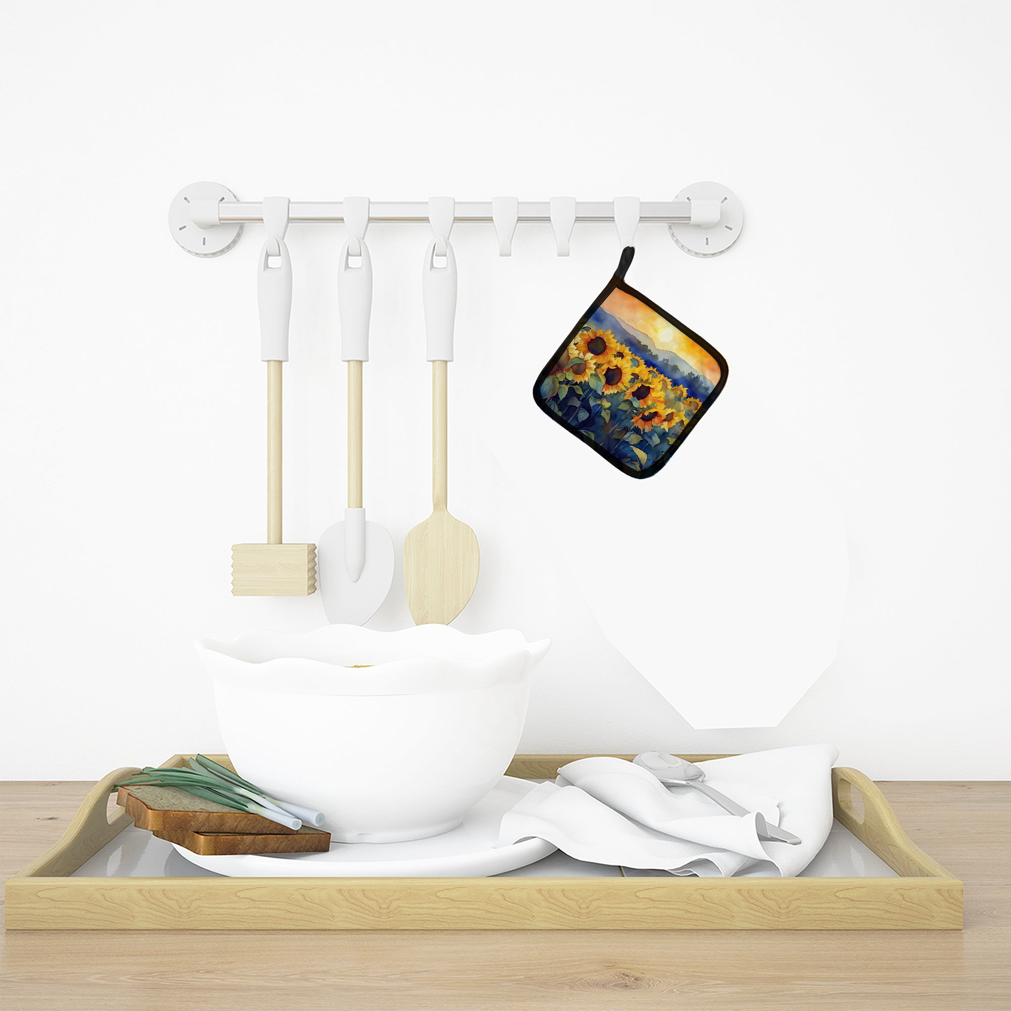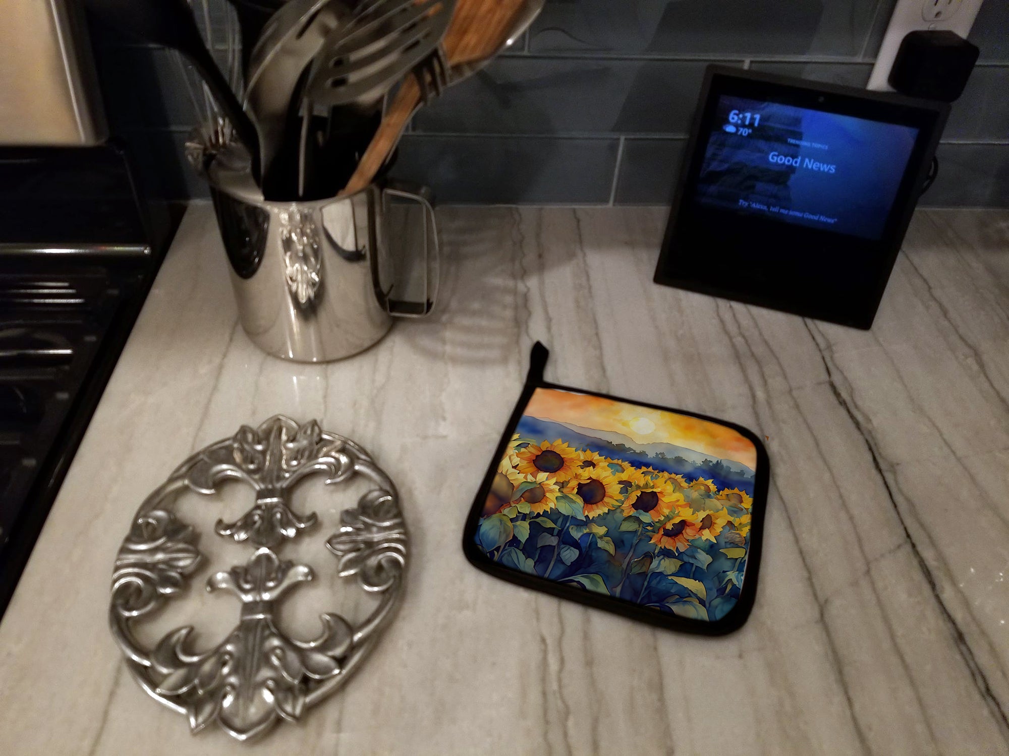 Pair of Pot Holders featuring breed specific Sunflowers artwork. A Pair of Pot Holders to match your kitchen decor. Made in the USA these are thick and functional. Full color artwork decorates the front polyester fabric of the hot pad and accented by a black trim. Use these at as a trivet for your Thanksgiving or Christmas tablescape. Filled with insulated fabric and quilted for durability. These colorful pot holders will make a great gift for your favorite home cook or executive chef. Each pot holder measures approximately 7 1/2 inches by 7 1/2 inches. A hanging tab is included.