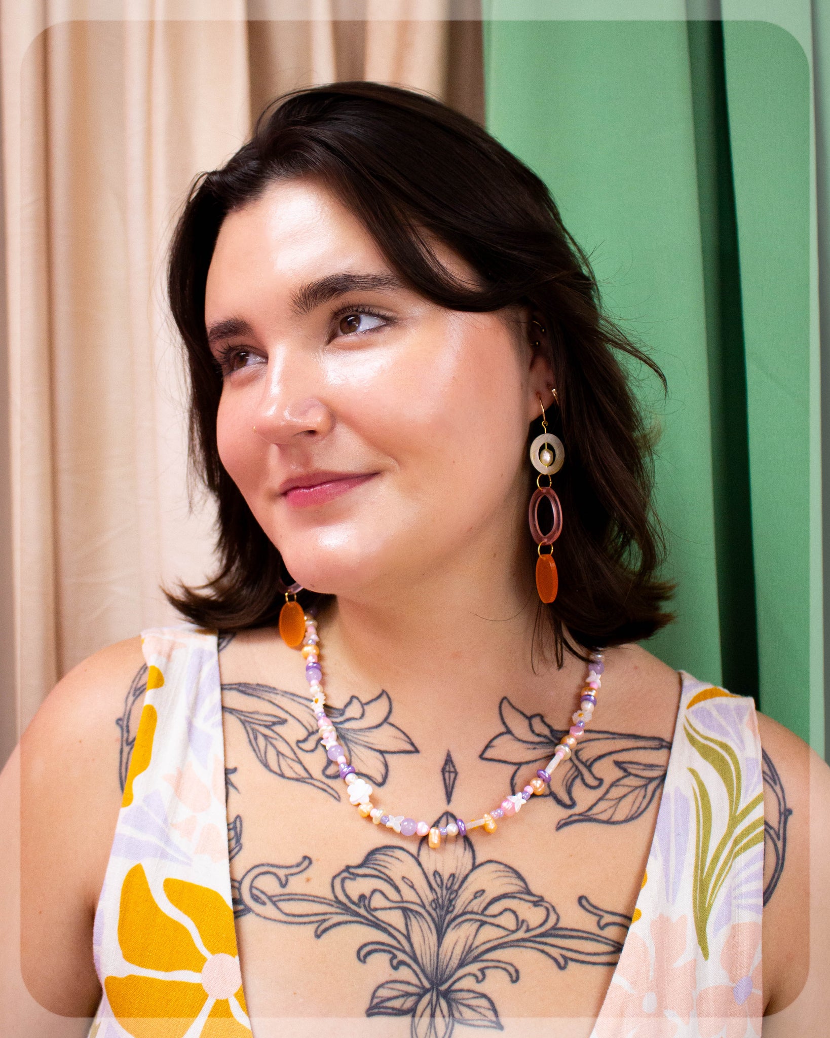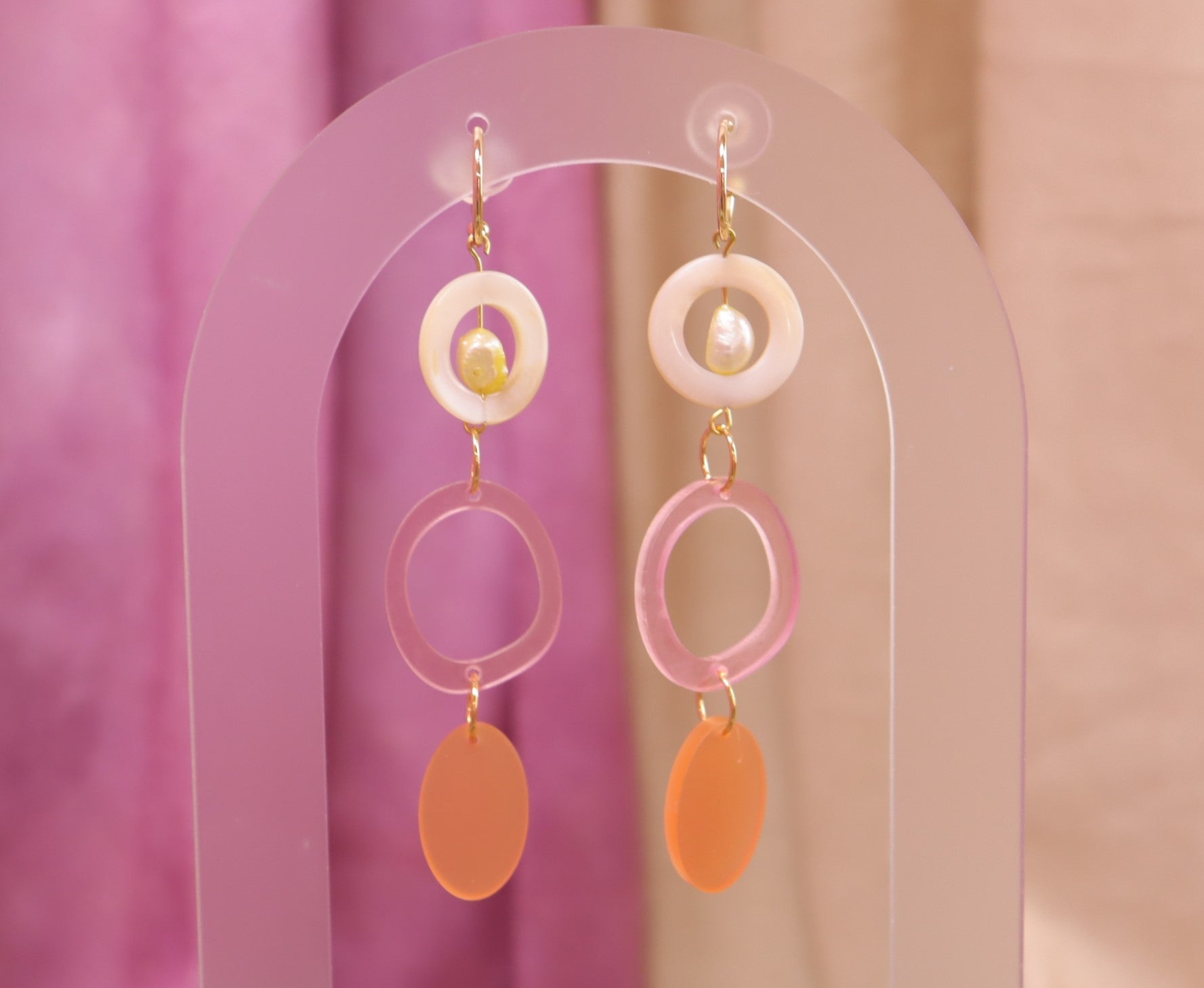 Embrace delicate elegance with the Sunrise Beach Earrings, featuring soft pink and orange acrylic pieces that dangle gracefully from a shell adorned with a freshwater pearl center. Lightweight and beautifully crafted, these earrings bring a subtle yet striking touch of coastal charm to any outfit, perfect for adding a refined, beach-inspired glow to your look.