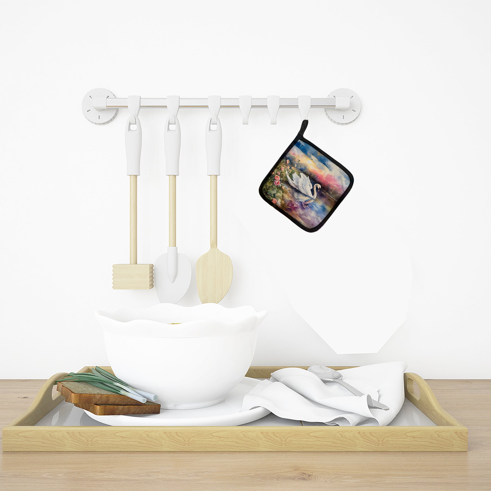 Pair of Pot Holders featuring breed specific Swan artwork. A Pair of Pot Holders to match your kitchen decor. Made in the USA these are thick and functional. Full color artwork decorates the front polyester fabric of the hot pad and accented by a black trim. Use these at as a trivet for your Thanksgiving or Christmas tablescape. Filled with insulated fabric and quilted for durability. These colorful pot holders will make a great gift for your favorite home cook or executive chef. Each pot holder measures approximately 7 1/2 inches by 7 1/2 inches. A hanging tab is included.