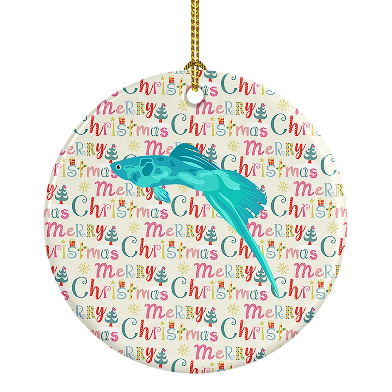 Decorate your space with our Christmas Sword Tail Guppy artwork on a Ornament. Add a touch of personalized charm to your Christmas tree this holiday season with our Ceramic Ornament. Measuring 2.8125 inches in diameter, this round porcelain ornament beautifully reflects your festive lights, enhancing your holiday decor. The gloss surface sets off the vibrant, full-color artwork contributed by one of our talented artists, bringing a pop of color and joy to your tree. This Ceramic Ornament doesn't stop at being merely decorative. The white back is designed for personalization. Write a heartfelt message, mark a special year, or inscribe a date with a paint pen or a permanent marker to create a treasured memento. Please ensure you allow any personalization to dry thoroughly before handling to maintain the pristine finish. Included with the ornament is a delicate gold cord for easy hanging. Made in the USA, this Ceramic Ornament makes an exceptional gift for a pet sitter, teacher, family member, or anyone you wish to share a little Christmas magic with. With its blend of style, charm, and personal touch, it's a meaningful addition to any Christmas tree.