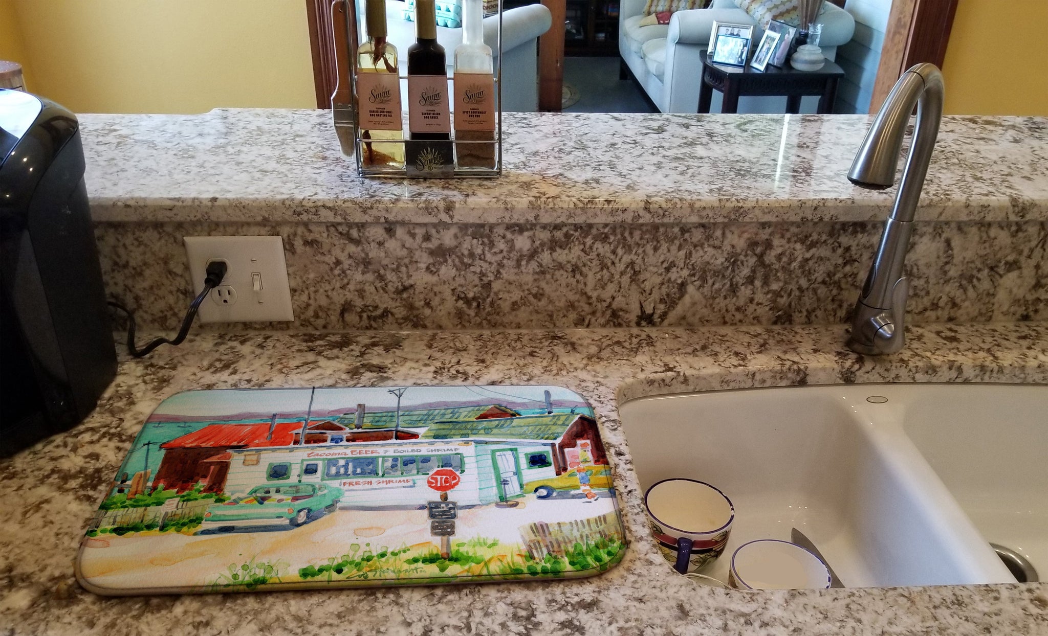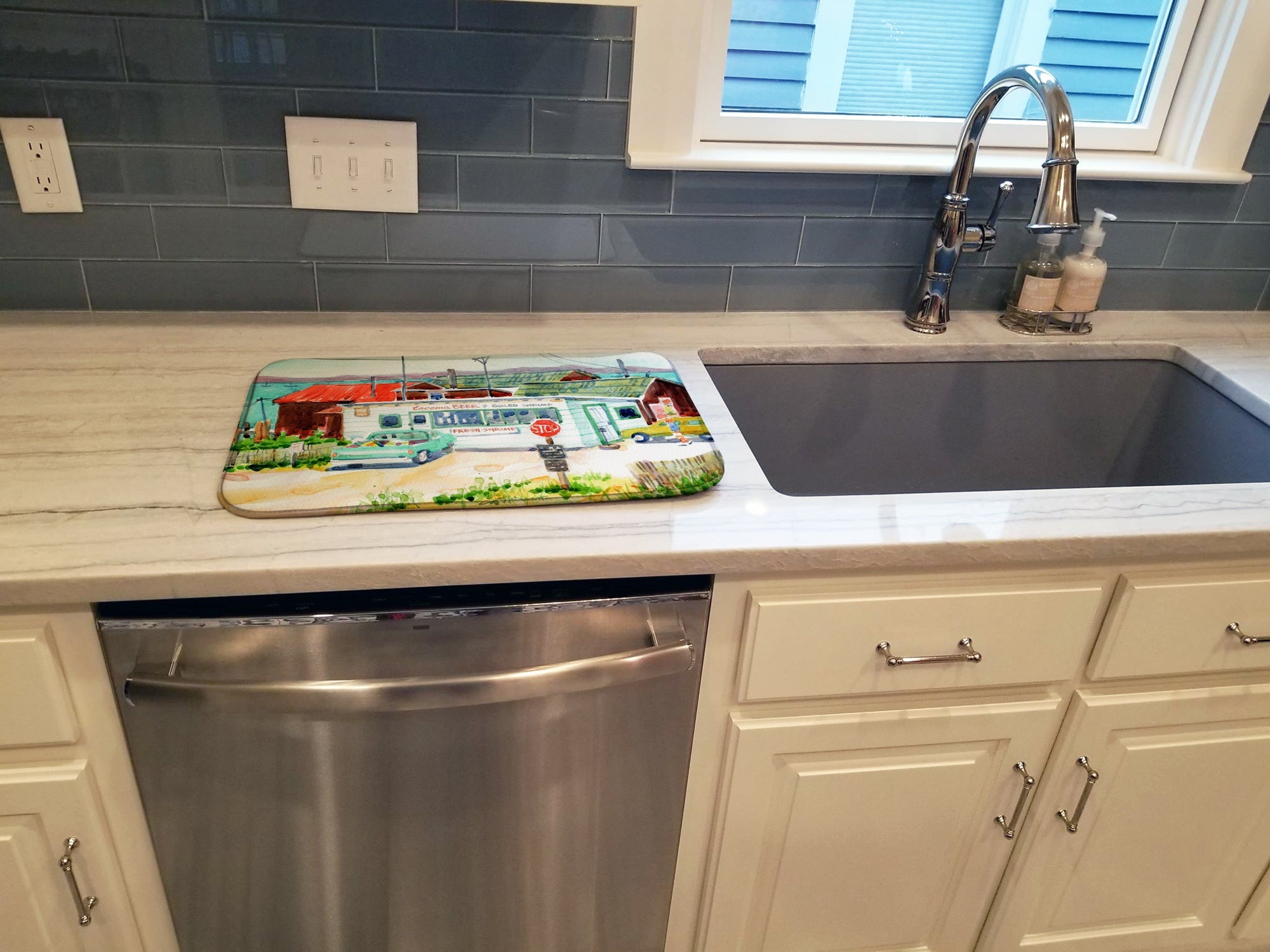 Say goodbye to messy countertops and soggy dish towels with our innovative dish drying mat. Our high-quality dish drying pad is designed to keep your countertops dry while offering a stylish and efficient solution. Whether you're air drying dishes, glasses, stemware, silverware, pots, pans, bottles, or even fruits and vegetables, our dish mat is the perfect choice. The 14 inches x 22 inches size fits most counters and dish drying racks, and the non-slip design ensures stability. Made with water-absorbent polyester and a polyurethane foam insert, our dish drying mat is not only functional but also durable. It's machine washable and printed in the USA for long-lasting use. The beautiful artwork adds flair to your kitchen decor, making it a perfect housewarming gift or present for any occasion. Upgrade your kitchen experience with our absorbent and versatile dish drying mat.
