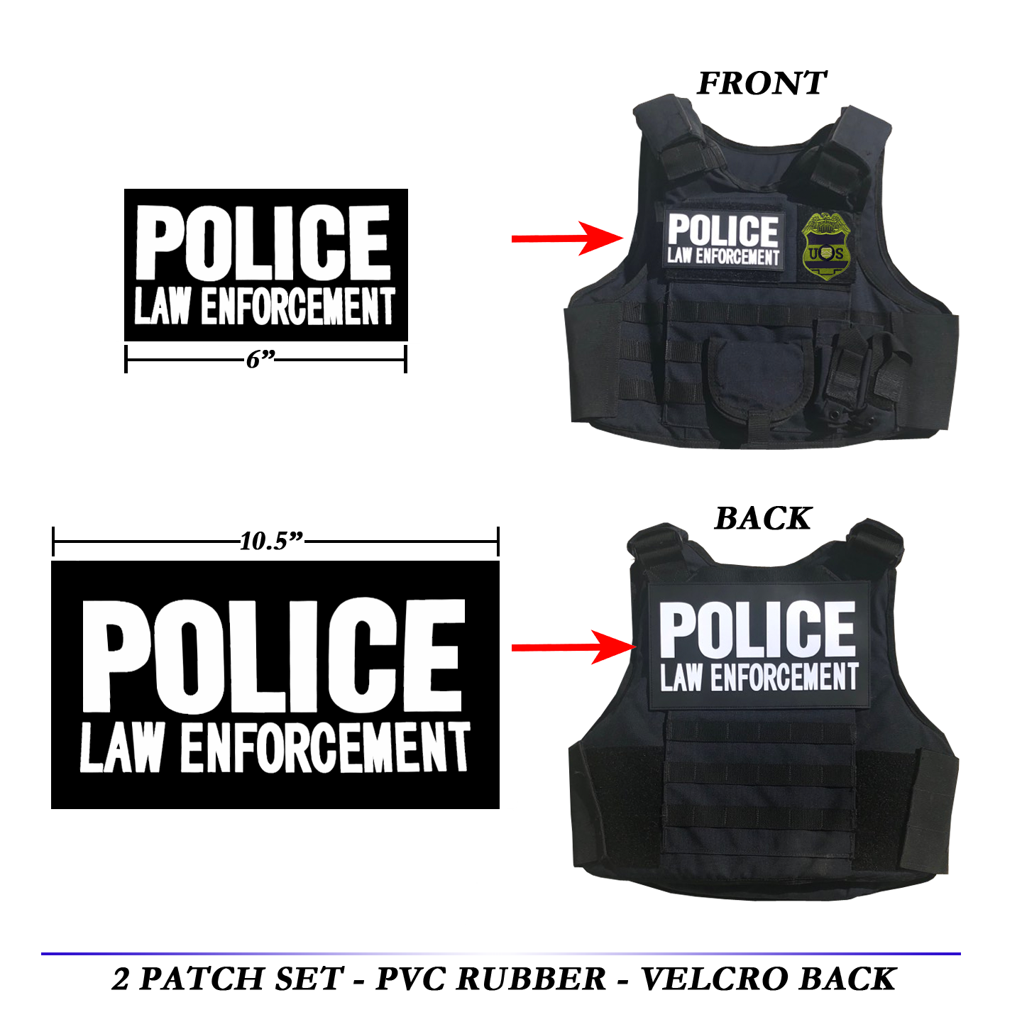 You get two patches in each set. These are not official issue and should never be worn by non-police. This is for the patches only, not a vest, not a carrier, just the patches. All sales are final.