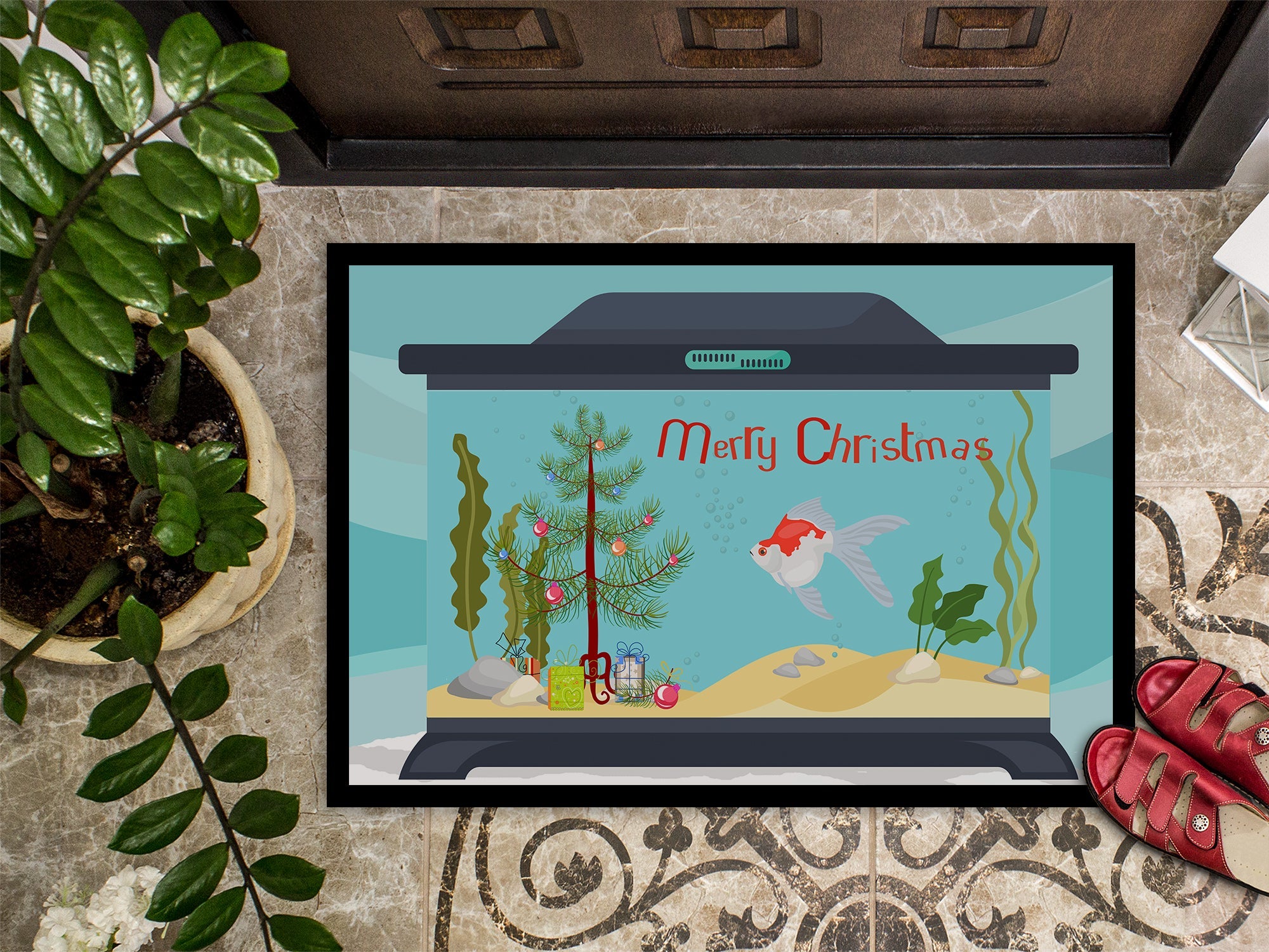 Decorate your space with our Christmas Tamasaba Goldfish artwork on a Doormat. Welcome your guests in style with our Artwork Door Mat, designed to withstand almost any weather condition. This mat, measuring approximately 24 by 36 inches, is held together by durable black binding tape. Its top layer, composed of polyester felt, is dyed with the eye-catching image you see on the mat. A few layers below provide the mat with stability, while its rubber bottom is stamped to help prevent slipping and ensures safety. Our mat works wonderfully as both an indoor or outdoor door mat. For cleaning, simply hose it off with water or use a power washer - no need for any cleaner that produces suds. Avoid scrubbing with a brush, instead, opt for the vacuum on floor setting. Designed manufactured and printed in the USA, this mat is a perfect addition to your porch, outdoor kitchen, entryway, or any indoor space. Its unique design makes it a charming decorative rug that greets your guests and adds a stylish touch to your home decor.