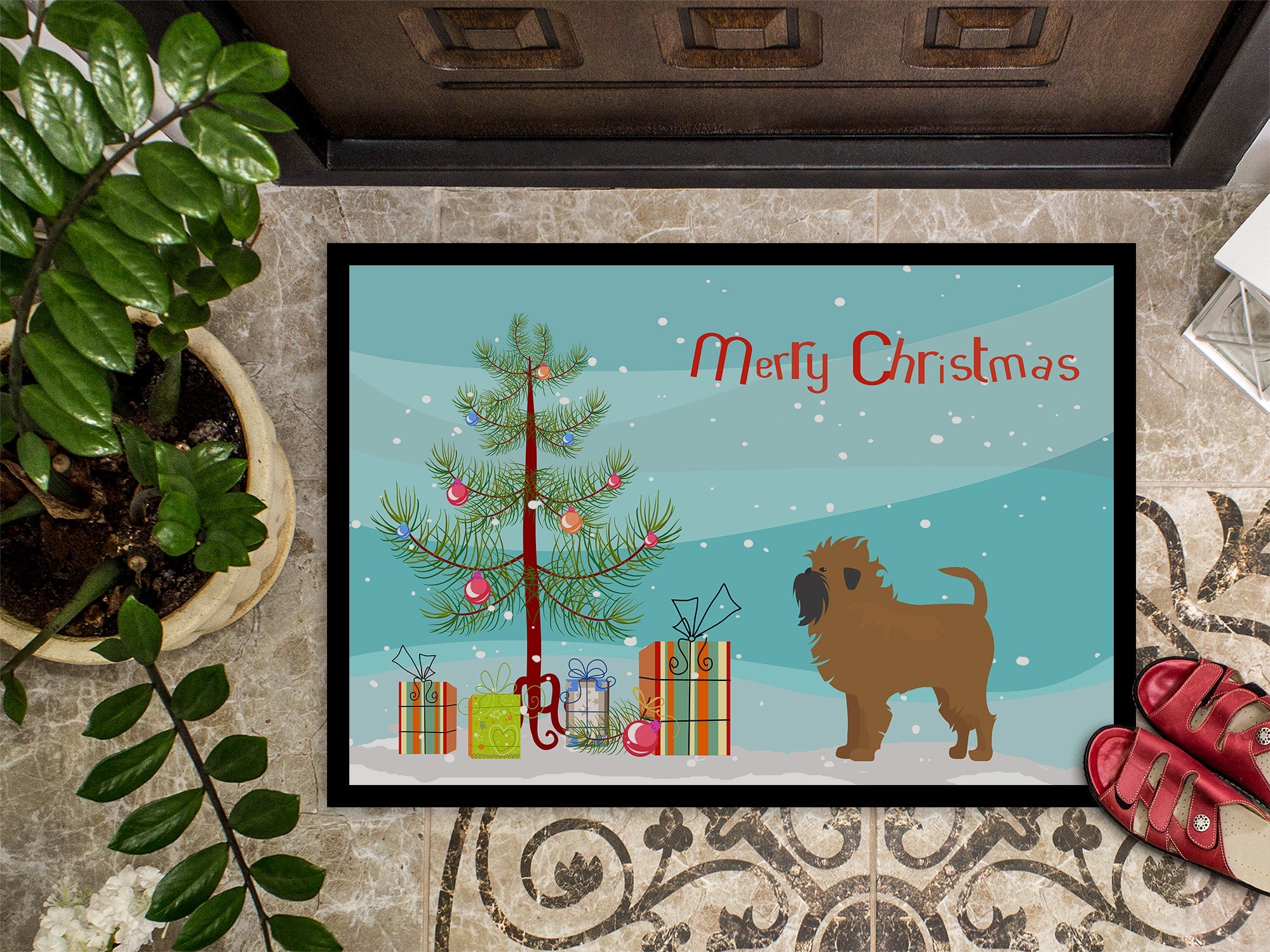 Decorate your space with our Christmas Affenpinscher artwork on a Doormat. Welcome your guests in style with our Artwork Door Mat, designed to withstand almost any weather condition. This mat, measuring approximately 24 by 36 inches, is held together by durable black binding tape. Its top layer, composed of polyester felt, is dyed with the eye-catching image you see on the mat. A few layers below provide the mat with stability, while its rubber bottom is stamped to help prevent slipping and ensures safety. Our mat works wonderfully as both an indoor or outdoor door mat. For cleaning, simply hose it off with water or use a power washer - no need for any cleaner that produces suds. Avoid scrubbing with a brush, instead, opt for the vacuum on floor setting. Designed manufactured and printed in the USA, this mat is a perfect addition to your porch, outdoor kitchen, entryway, or any indoor space. Its unique design makes it a charming decorative rug that greets your guests and adds a stylish touch to your home decor.