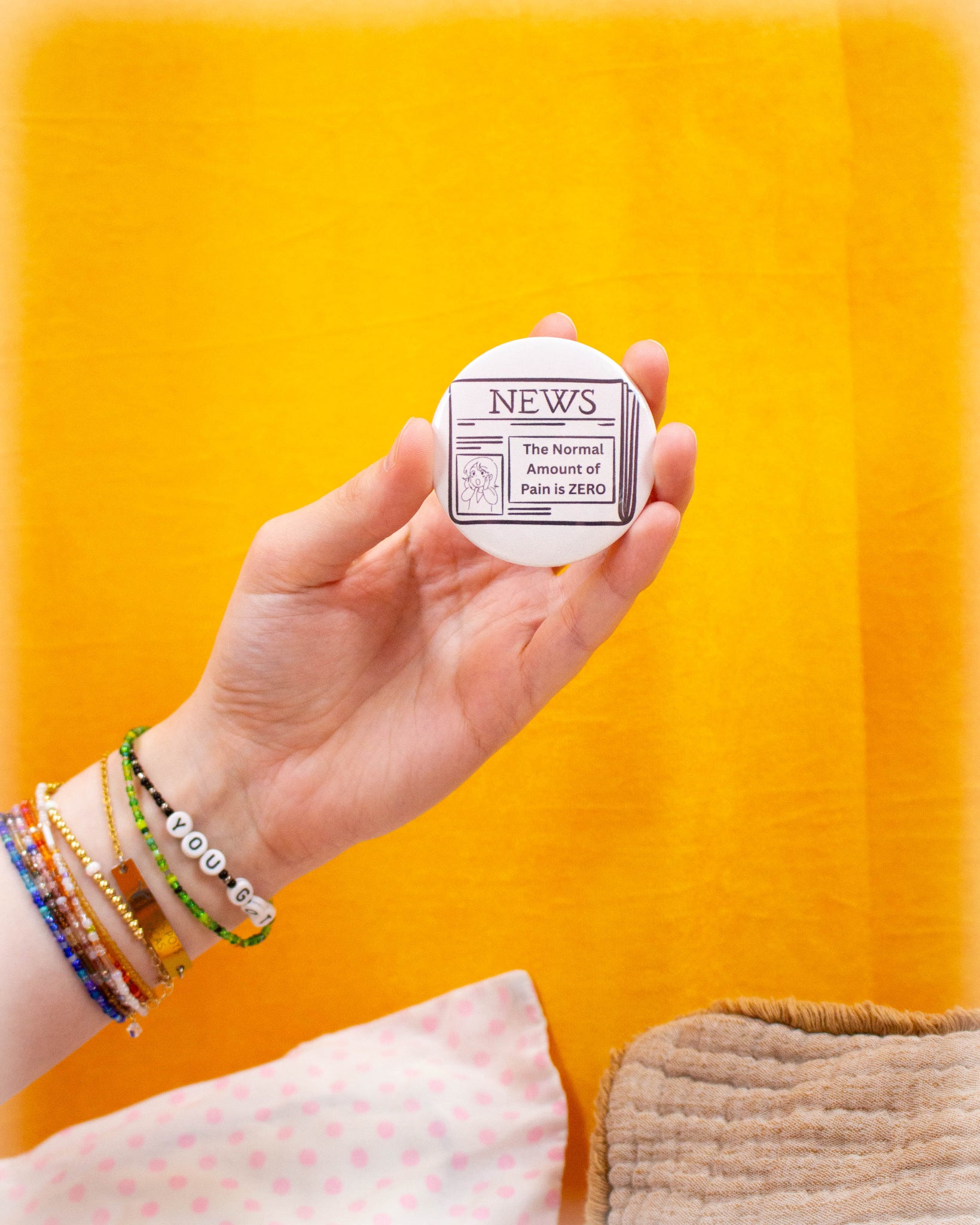 A wearable headline for those tired of being told “it’s just part of life.” The "Normal Amount of Pain is Zero" pin says what needs to be said—clearly and unapologetically.
