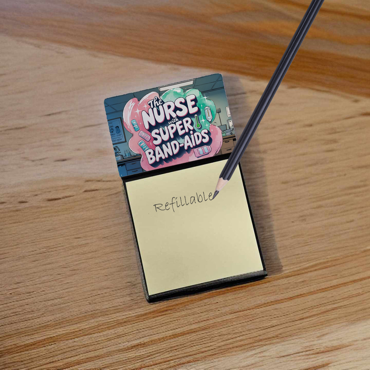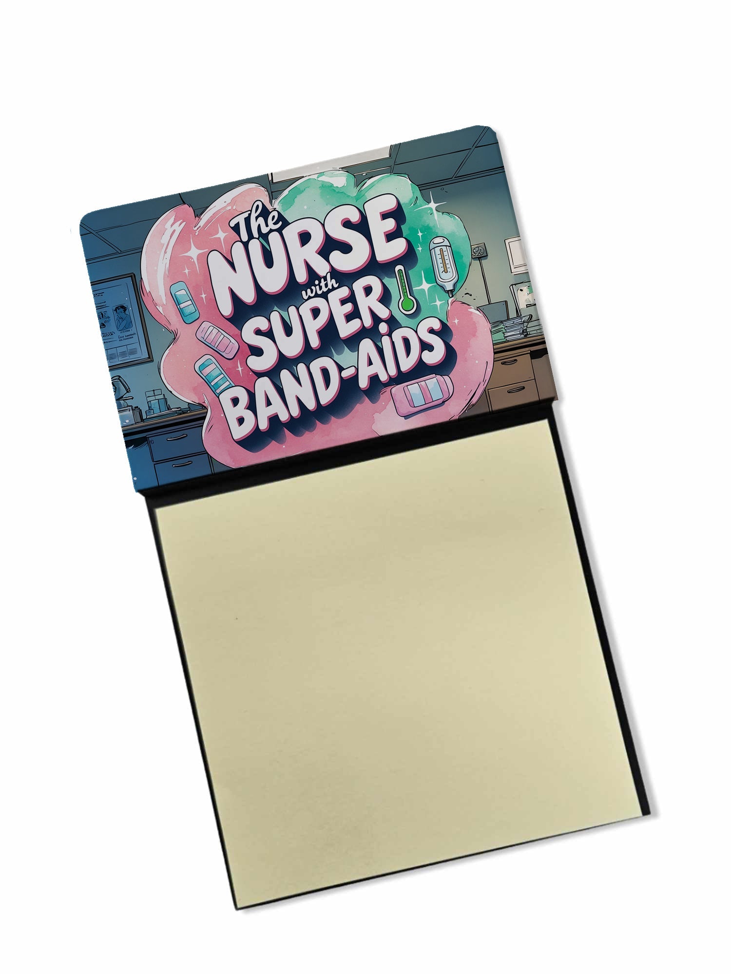 Celebrate the educators who inspire every day with this funny teacher sticky note holder from Caroline’s Treasures. Proudly made in the USA, each design features the phrase The Nurse with Super Band-Aids - in bold, colorful artwork that turns an everyday desk accessory into a thoughtful gift. The sturdy base holds 3" x 3" sticky notes securely while you write, and the glossy aluminum art plate adds a durable, fade-resistant finish that lasts. Refilling is easy—just roll a piece of tape around your finger, press it to the back sheet of a new pad, and attach it to the board. Ideal for classrooms, offices, or home desks, these note holders make a meaningful gift for Teacher Appreciation Week, back-to-school, end-of-year celebrations, or simply saying thank you.
