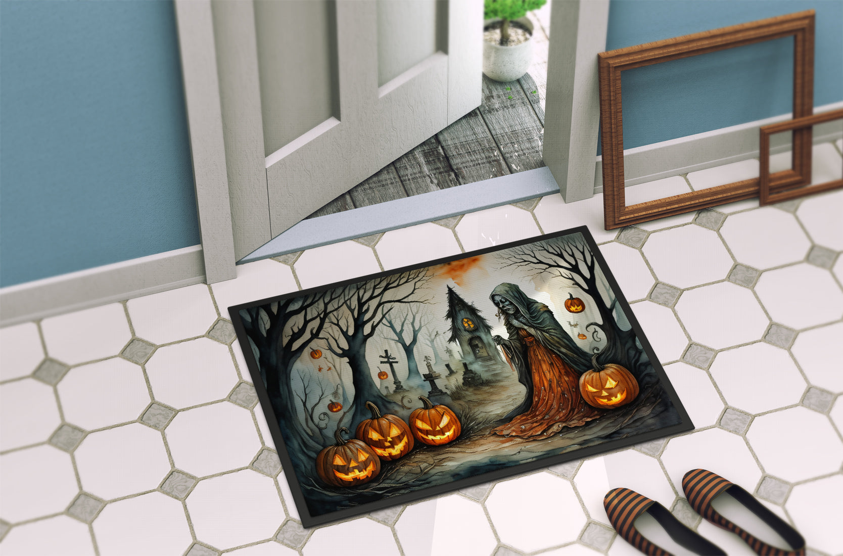 Decorate your space with our Halloween artwork on a Doormat. Welcome your guests in style with our Artwork Door Mat, designed to withstand almost any weather condition. This mat, measuring approximately 18 by 27 inches, is held together by durable black binding tape. Its top layer, composed of polyester felt, is dyed with the eye-catching image you see on the mat. A few layers below provide the mat with stability, while its rubber bottom is stamped to help prevent slipping and ensures safety. Our mat works wonderfully as both an indoor or outdoor door mat. For cleaning, simply hose it off with water or use a power washer - no need for any cleaner that produces suds. Avoid scrubbing with a brush, instead, opt for the vacuum on floor setting. Designed manufactured and printed in the USA, this mat is a perfect addition to your porch, outdoor kitchen, entryway, or any indoor space. Its unique design makes it a charming decorative rug that greets your guests and adds a stylish touch to your home decor.