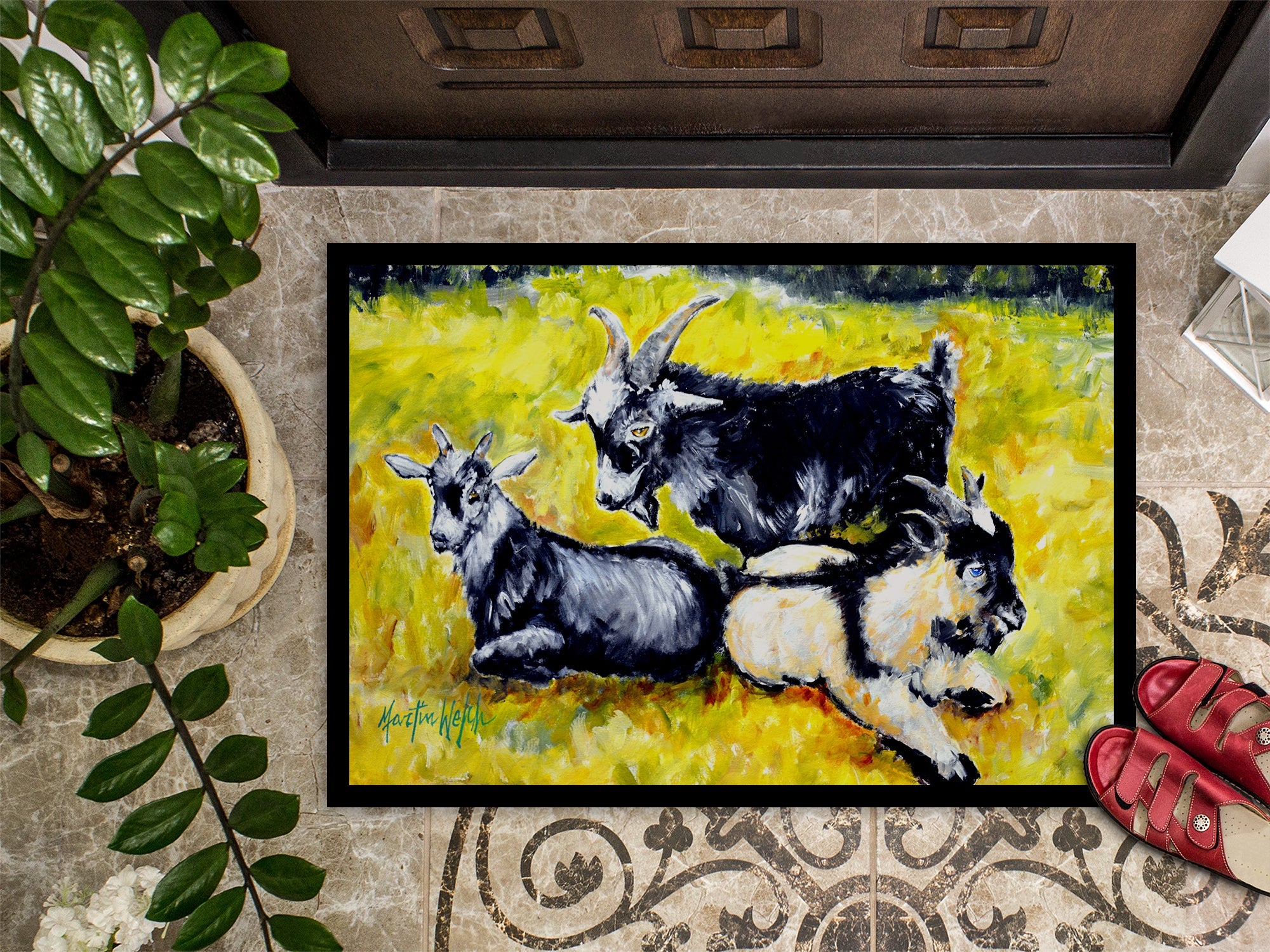 Decorate your space with our Goat artwork on a Doormat. Welcome your guests in style with our Artwork Door Mat, designed to withstand almost any weather condition. This mat, measuring approximately 18 by 27 inches, is held together by durable black binding tape. Its top layer, composed of polyester felt, is dyed with the eye-catching image you see on the mat. A few layers below provide the mat with stability, while its rubber bottom is stamped to help prevent slipping and ensures safety. Our mat works wonderfully as both an indoor or outdoor door mat. For cleaning, simply hose it off with water or use a power washer - no need for any cleaner that produces suds. Avoid scrubbing with a brush, instead, opt for the vacuum on floor setting. Designed manufactured and printed in the USA, this mat is a perfect addition to your porch, outdoor kitchen, entryway, or any indoor space. Its unique design makes it a charming decorative rug that greets your guests and adds a stylish touch to your home decor.