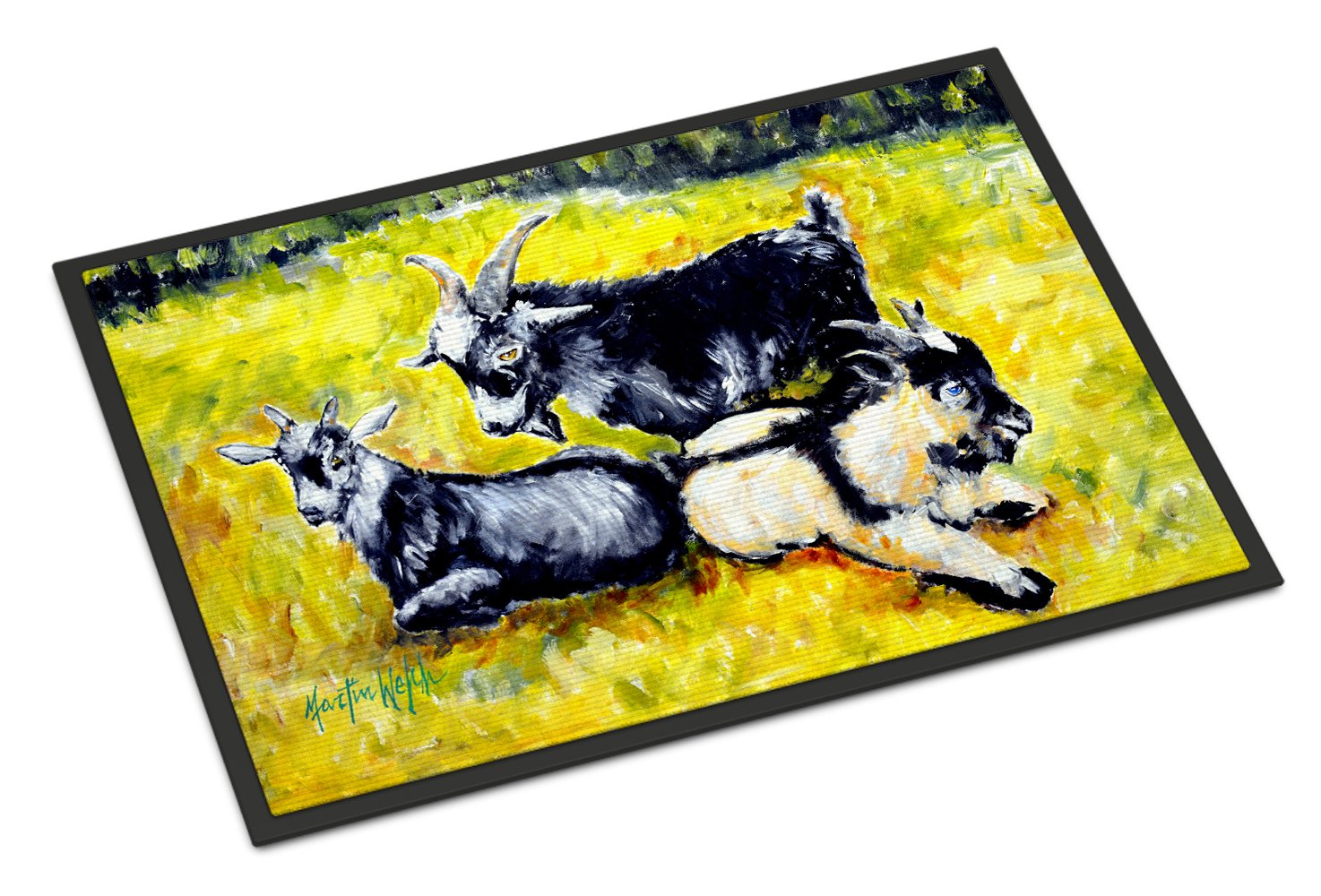 Decorate your space with our Goat artwork on a Doormat. Welcome your guests in style with our Artwork Door Mat, designed to withstand almost any weather condition. This mat, measuring approximately 24 by 36 inches, is held together by durable black binding tape. Its top layer, composed of polyester felt, is dyed with the eye-catching image you see on the mat. A few layers below provide the mat with stability, while its rubber bottom is stamped to help prevent slipping and ensures safety. Our mat works wonderfully as both an indoor or outdoor door mat. For cleaning, simply hose it off with water or use a power washer - no need for any cleaner that produces suds. Avoid scrubbing with a brush, instead, opt for the vacuum on floor setting. Designed manufactured and printed in the USA, this mat is a perfect addition to your porch, outdoor kitchen, entryway, or any indoor space. Its unique design makes it a charming decorative rug that greets your guests and adds a stylish touch to your home decor.